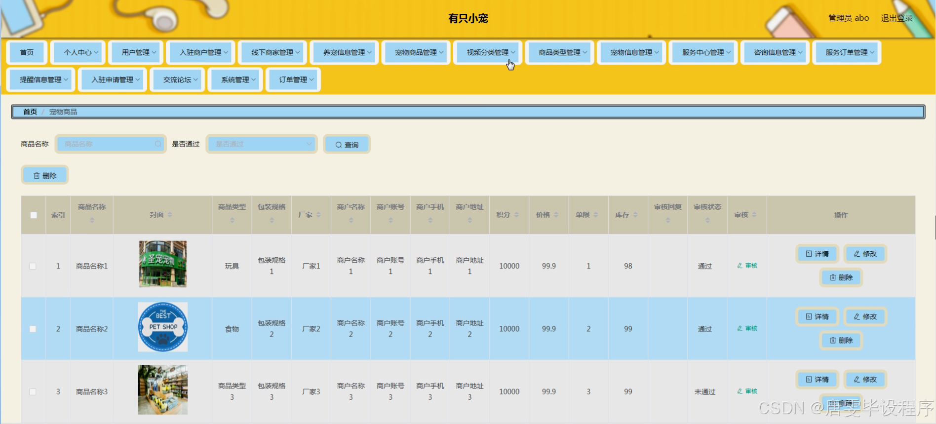 “有只小宠”平台的研究内容涵盖了多个核心功能模块。在用户模块,平台将提供用户注册、登录、个人信息管理等功能,确保用户能够安全、便捷地使用平台服务。入驻商户和线下商家模块则负责商家的入驻申请、资质审核、商品和服务发布等流程,为商家提供一个展示和销售宠物相关产品的平台。养宠信息模块将整合宠物饲养、健康、训练等方面的知识,为用户提供科学的养宠指导。宠物商品模块则提供丰富的宠物商品供用户选择购买,并支持商品分类、搜索、筛选等功能。视频分类模块将收录各类宠物相关的视频内容,如宠物日常、训练教程等,供用户观看学习。商品类型模块将细化商品分类,便于用户快速找到所需商品。宠物信息模块将记录宠物的基本信息、健康档案等,为用户提供宠物健康管理服务。服务中心模块将提供宠物医疗、美容、寄养等服务的预约和咨询功能。咨询信息模块将收集用户在使用过程中的问题和反馈,为用户提供及时的帮助。服务订单模块将管理用户的服务预约和订单状态,确保服务流程的顺畅进行。提醒信息模块将提供宠物疫苗接种、驱虫等事项的提醒服务,帮助用户合理安排宠物健康管理计划。入驻申请模块将处理商家的入驻申请,确保平台商家的合法性和服务质量。