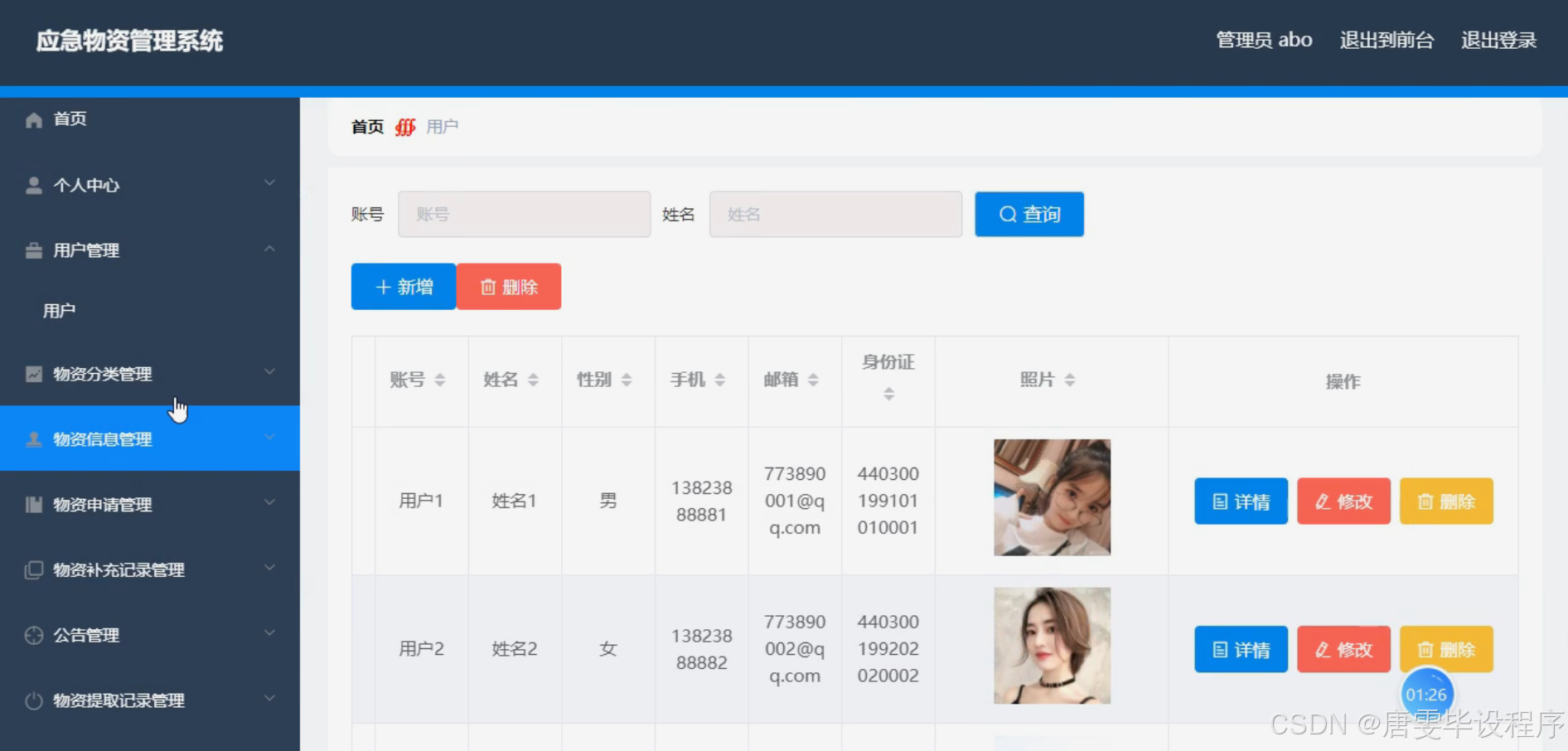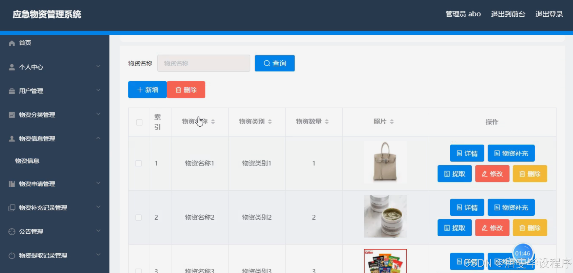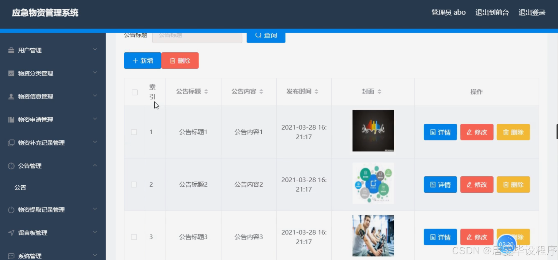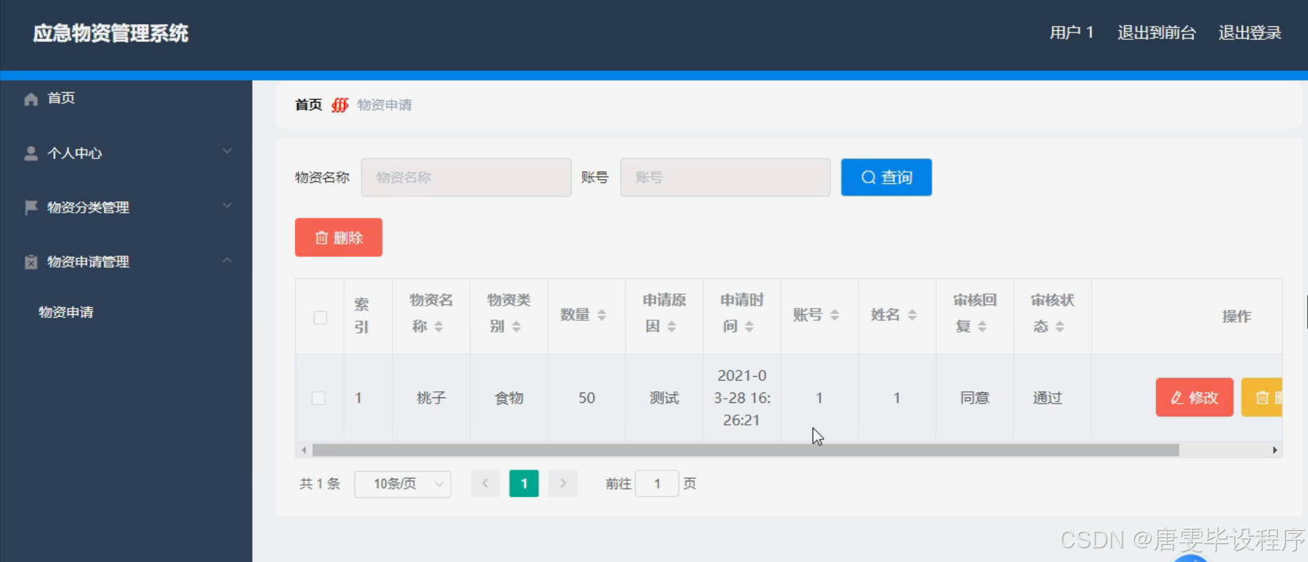 本研究旨在设计并实现一个功能完善的应急物资管理系统,以提高应急物资管理的效率和准确性。通过该系统,用户能够方便地查询物资信息、提交物资申请、记录物资补充和使用情况,从而实现物资的全程跟踪和监控。同时,系统还能提供公告发布功能,确保信息的及时传达。通过这些功能的实现,旨在提升应急响应的敏捷性和物资调配的精准性,为应对突发事件提供有力支持。
