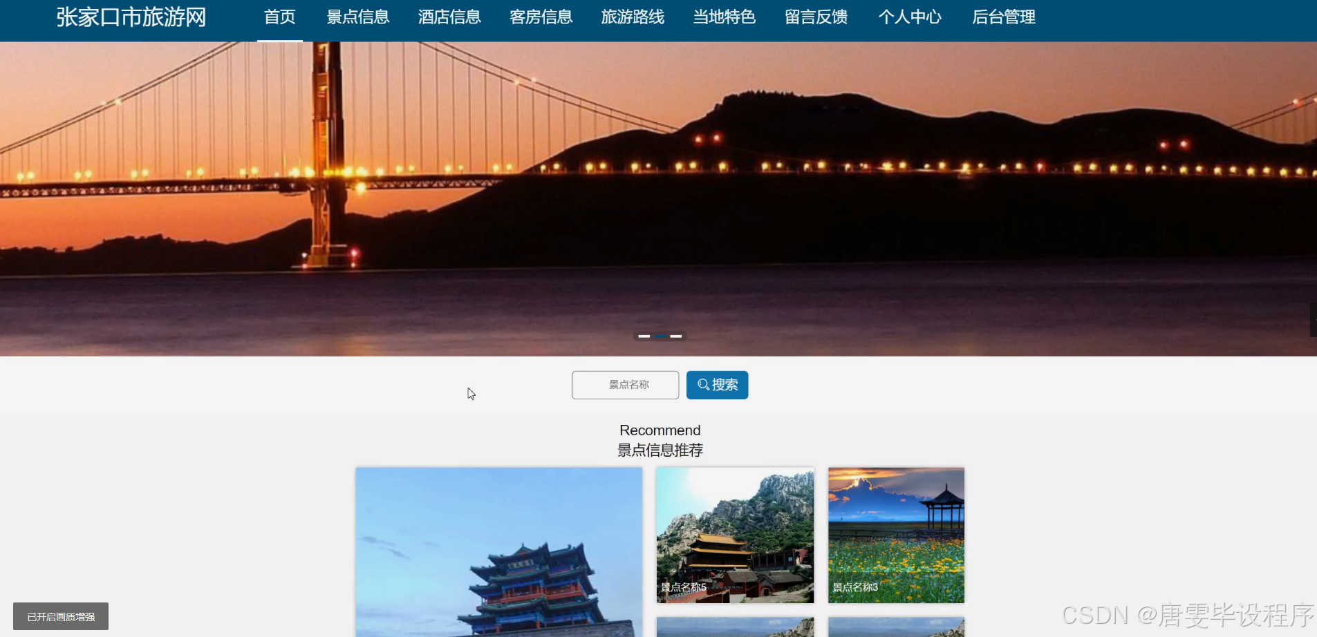 张家口市,位于中国河北省北部,拥有丰富的自然与文化旅游资源,包括壮丽的草原风光、悠久的历史遗迹和独特的民俗风情。随着旅游业的蓬勃发展,张家口市正逐渐成为国内外游客青睐的旅游目的地。然而,传统的旅游服务方式已难以满足日益增长的游客需求,特别是在信息获取、行程规划及预订服务方面。因此,构建一个集信息查询、预订服务于一体的张家口市旅游网,成为提升旅游服务质量、促进旅游业转型升级的关键举措。通过数字化手段整合旅游资源,不仅能够为游客提供更加便捷、个性化的旅游体验,还能有效推动张家口市旅游产业的可持续发展。