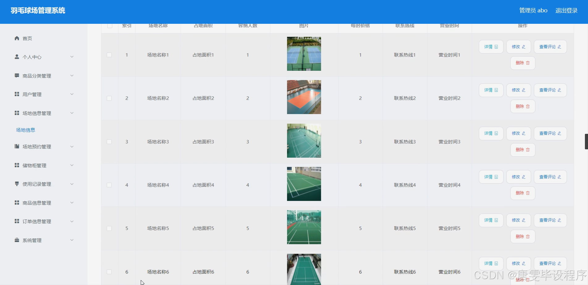 本研究内容主要包括羽毛球场管理系统的功能设计与实现。系统功能涵盖用户信息管理、场地信息管理、场地预约管理、储物柜管理、使用记录管理、商品分类管理、商品信息管理以及订单信息管理等多个方面。用户信息管理模块负责用户的注册、登录和个人信息管理;场地信息管理模块用于维护羽毛球馆的场地信息,包括场地类型、容量、位置等;场地预约管理模块实现用户在线预约场地、取消预约和查看预约记录等功能;储物柜管理模块提供储物柜的租赁、归还和状态查询等服务;使用记录管理模块记录场地的使用情况和用户的行为轨迹;商品分类管理、商品信息管理和订单信息管理模块则用于实现体育用品的在线销售、库存管理和订单处理等功能。通过这些功能的实现,系统可以为用户提供便捷、高效的服务体验,同时帮助管理者实现对羽毛球馆的全面管理和监控。