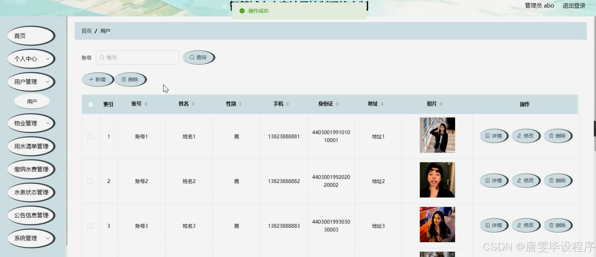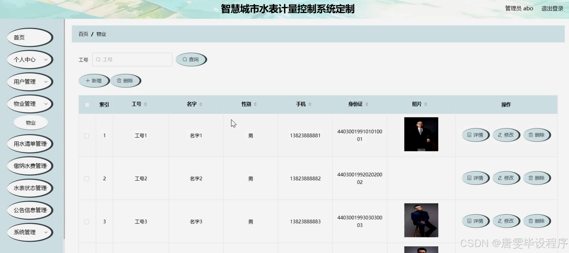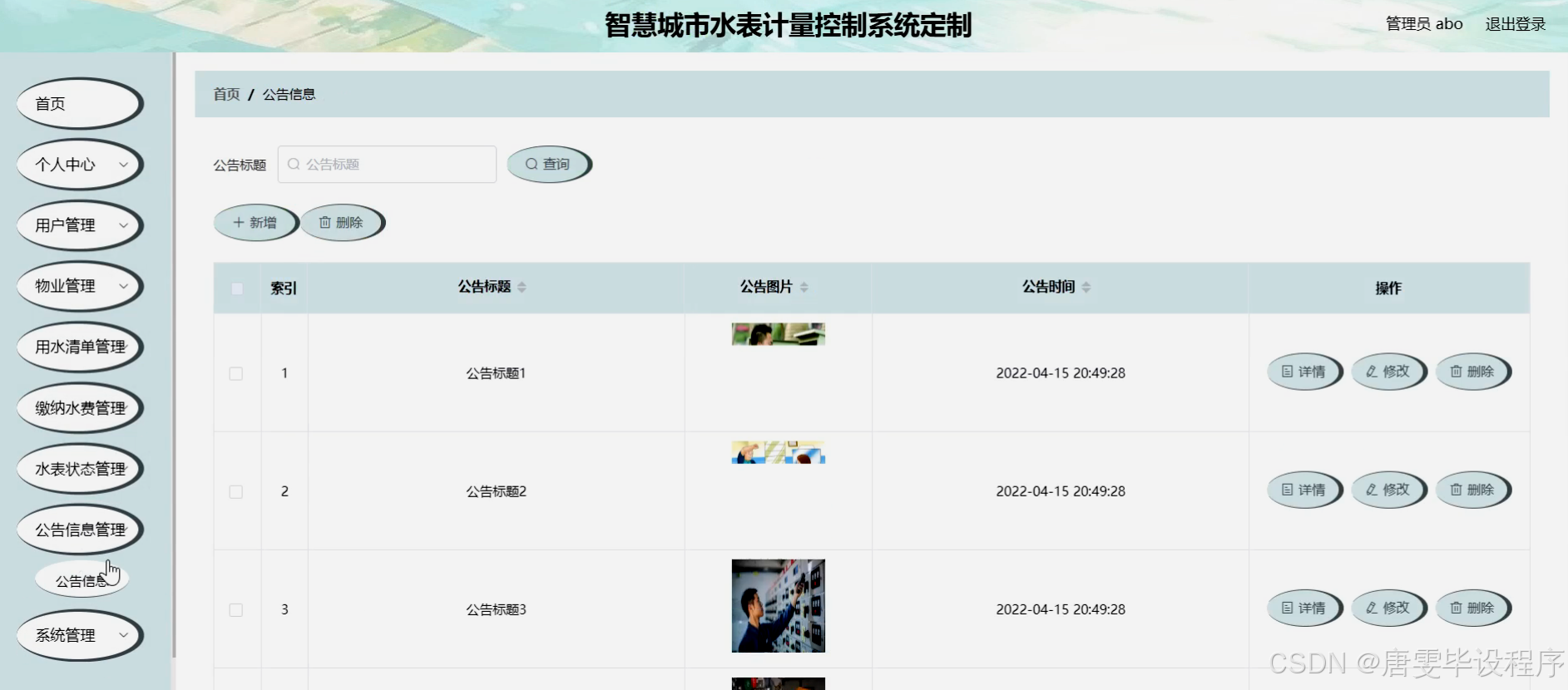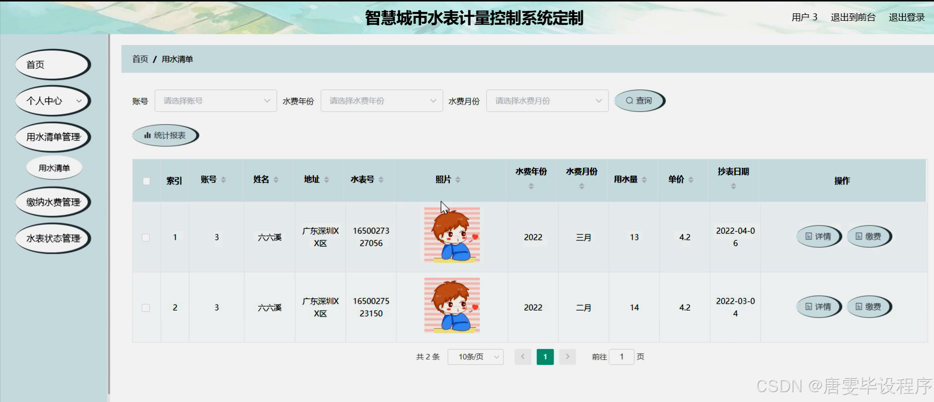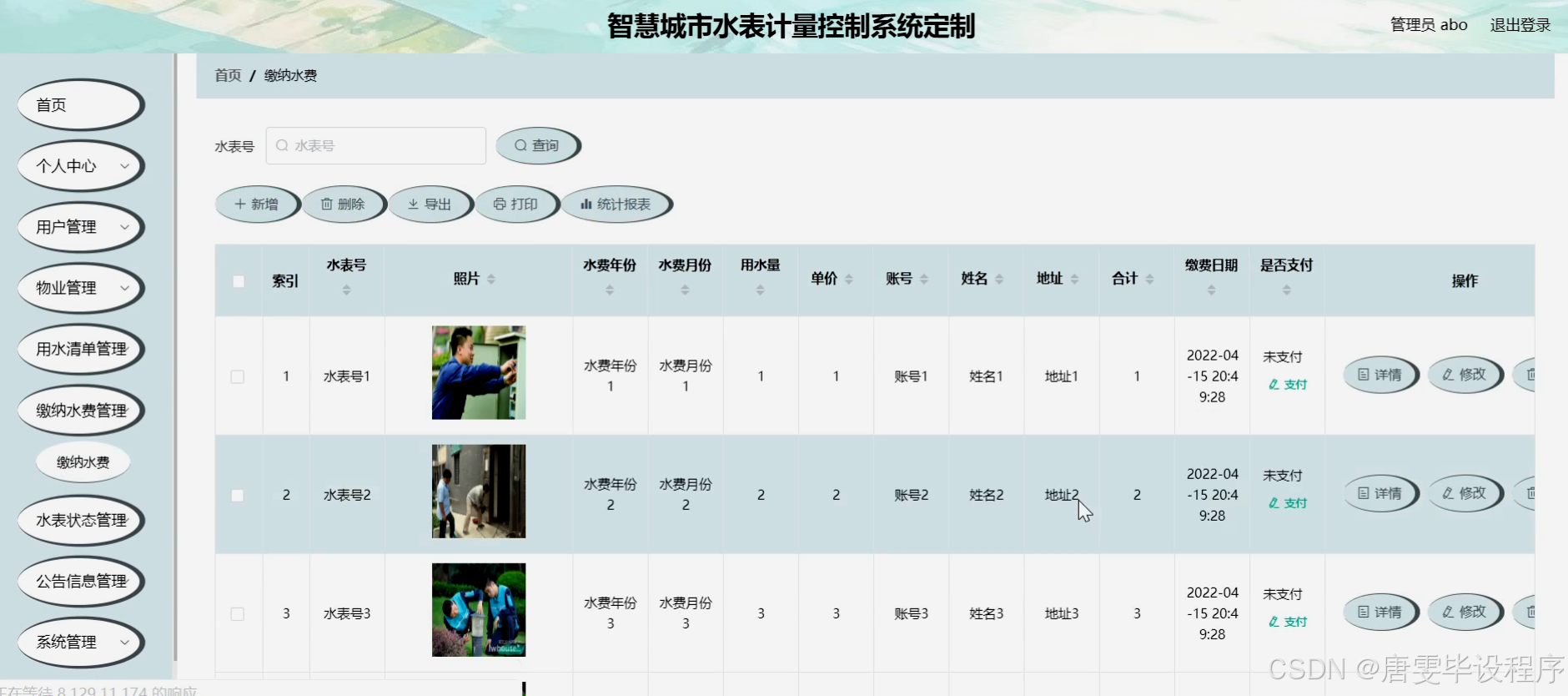 本研究旨在设计并实现一套智慧城市水表计量控制系统,以满足用户、物业和水资源管理部门的多元化需求。通过该系统,用户能够方便地查看用水清单、缴纳水费,并接收水表状态和公告信息等;物业能够实现对水表数据的远程采集、实时监控和智能化管理,提高管理效率和服务质量;水资源管理部门则能够获取准确、及时的水表数据,为城市水资源规划、调度和监管提供有力支持。