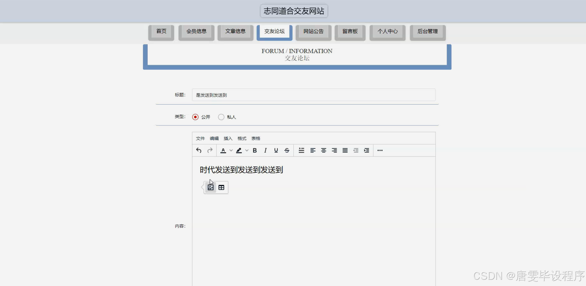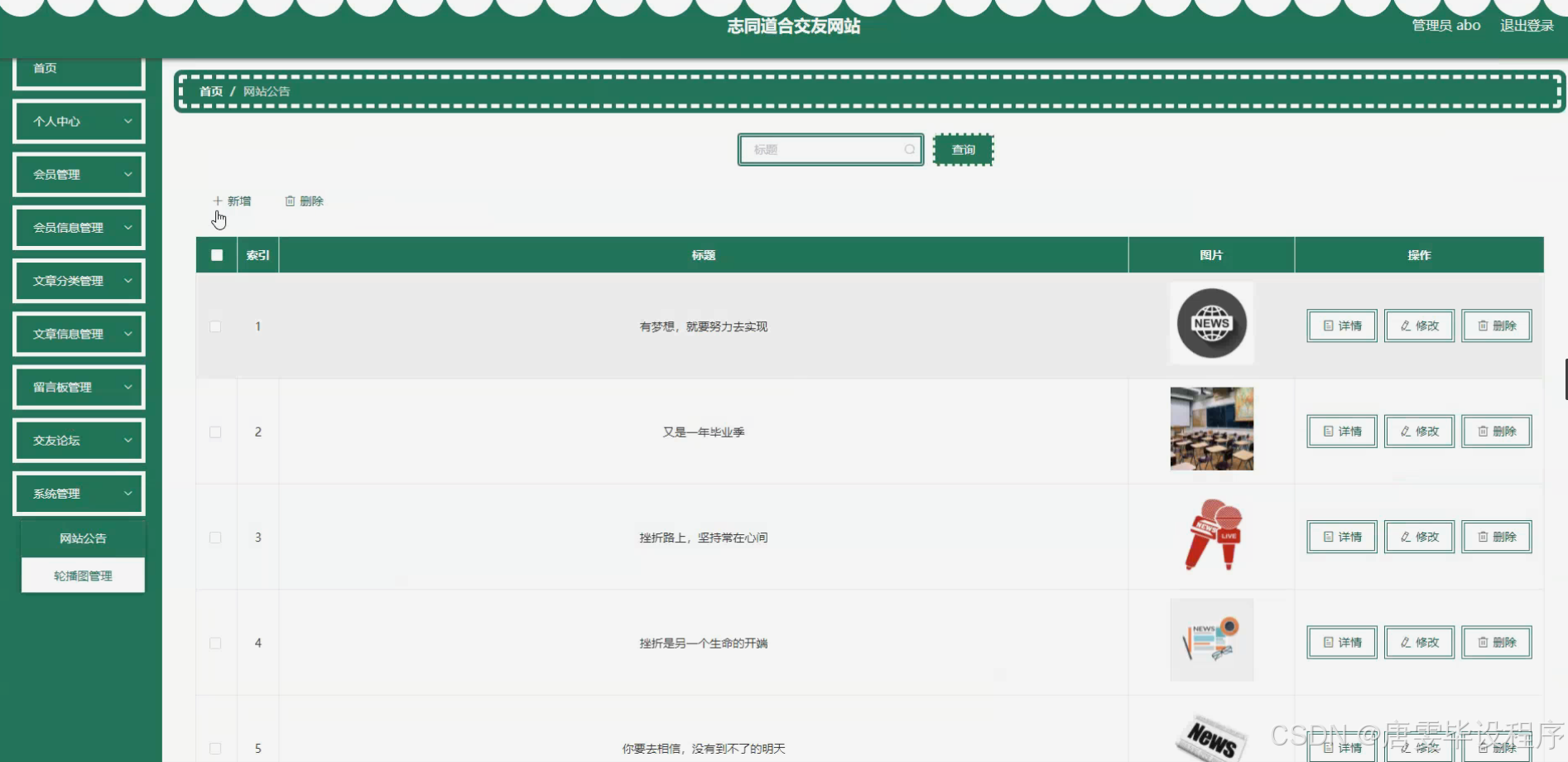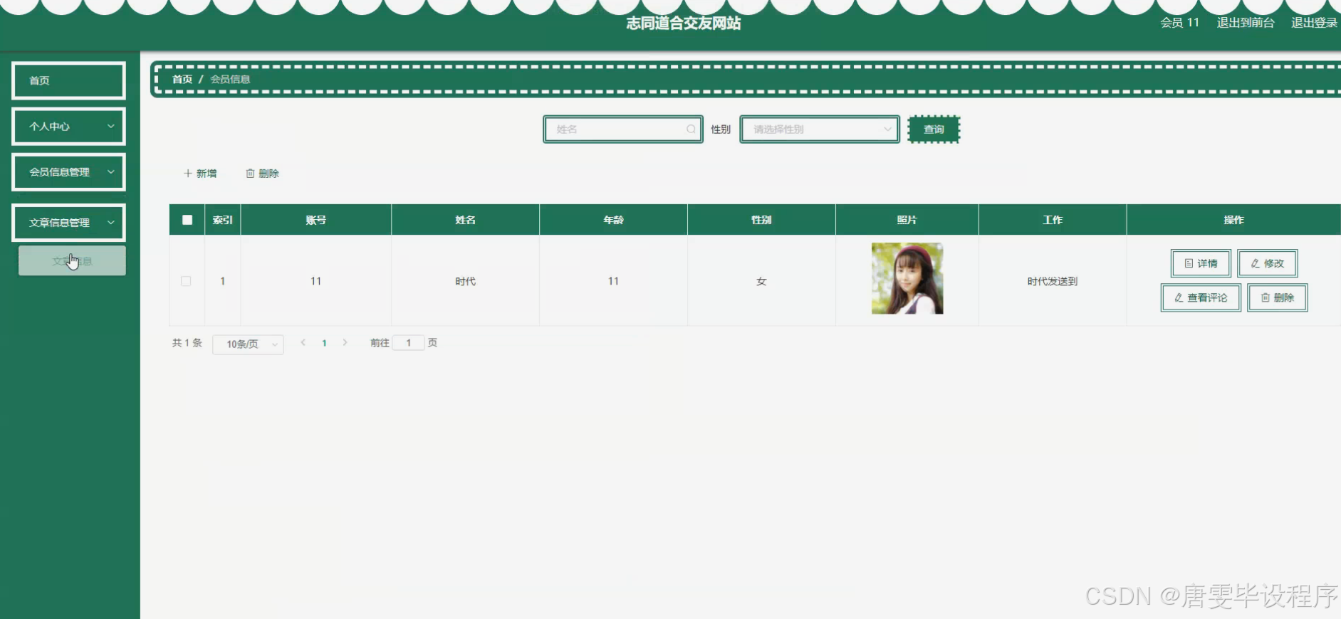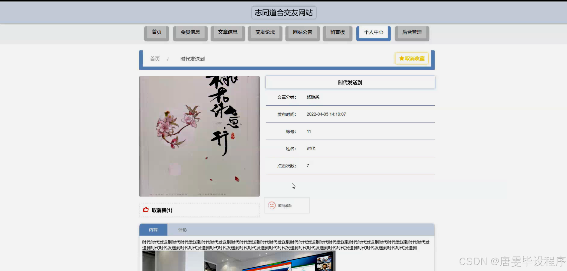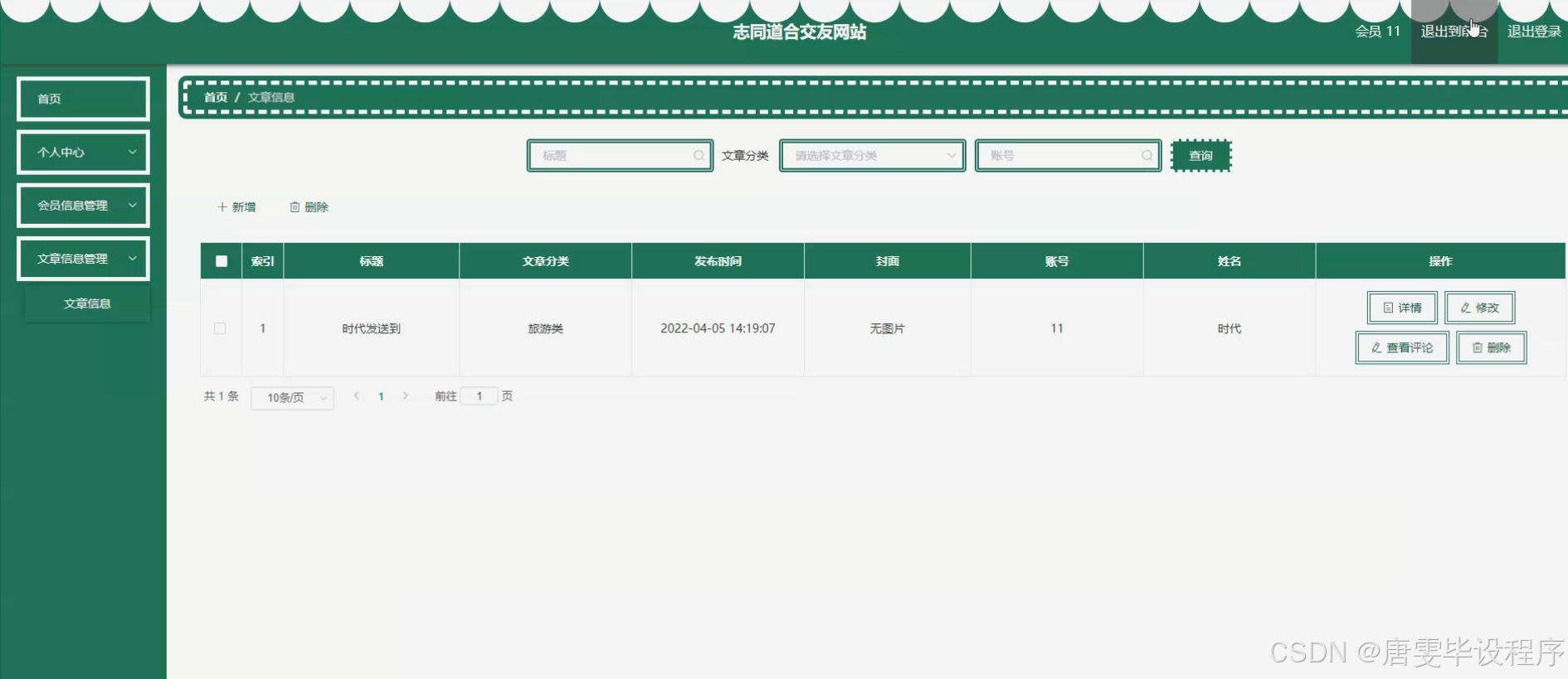 本研究旨在设计并实现一个功能完善的志同道合交友网站,以满足现代人多元化、个性化的交友需求。通过深入分析用户需求和行为特点,我们将构建一个集会员管理、文章分类、文章信息发布、会员信息展示等功能于一体的综合性社交平台。该网站将致力于为用户提供一个安全、友好、高效的交友环境,让他们在享受社交乐趣的同时,也能找到与自己志同道合的朋友,共同追求更高质量的生活。