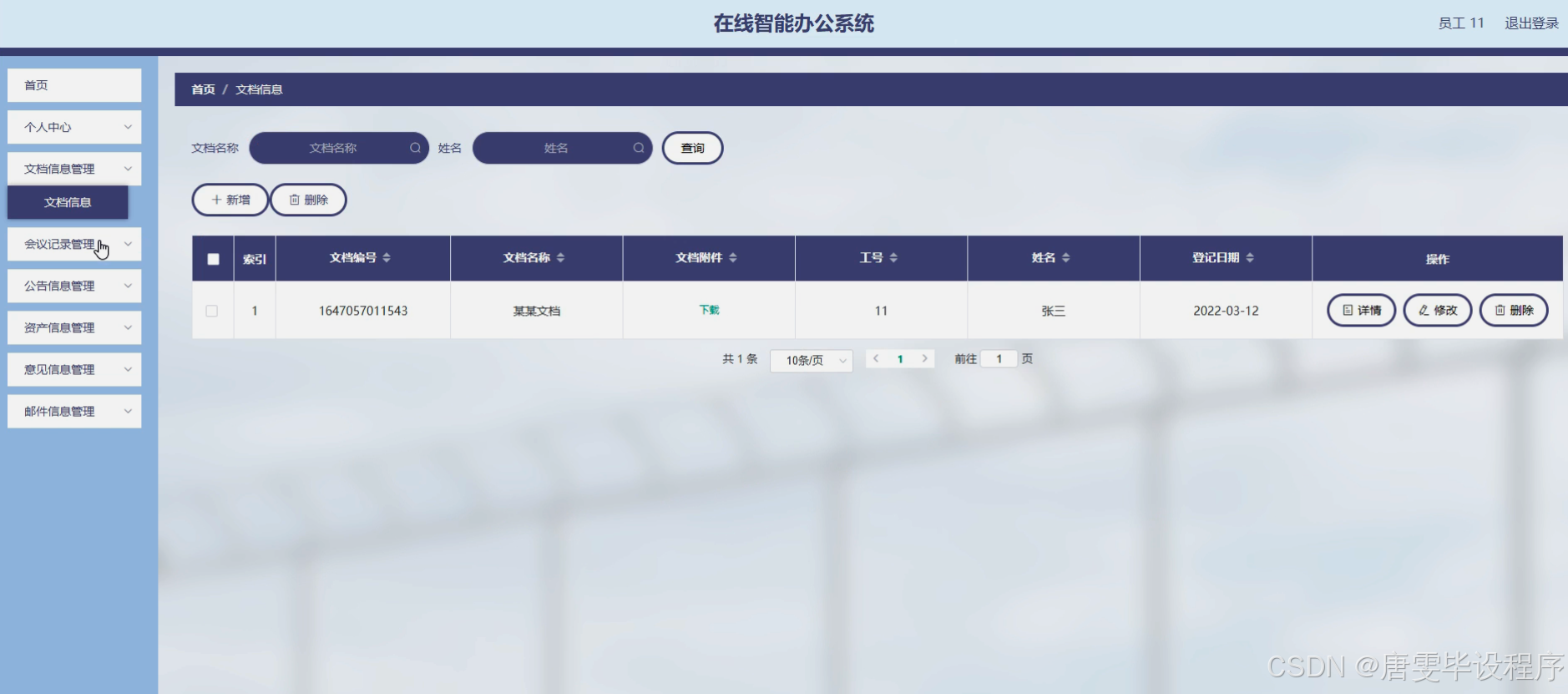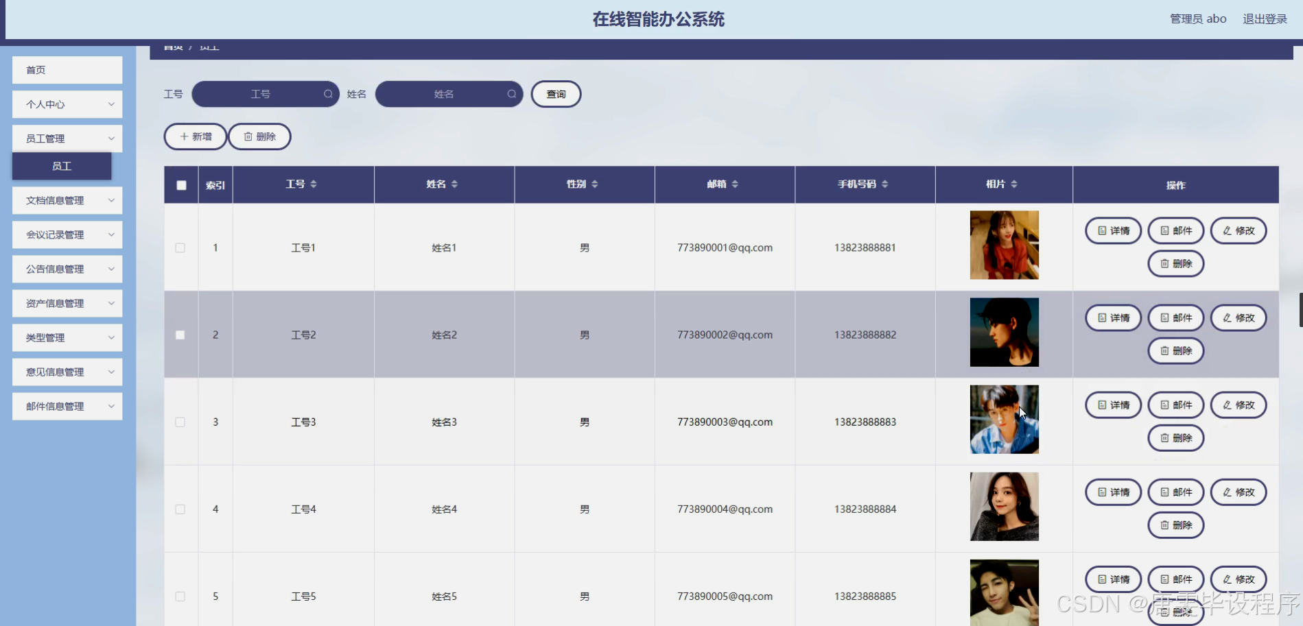 在线智能办公系统的研究内容涵盖多个核心功能模块的设计与实现。员工模块负责员工信息的录入、查询和更新,为企业管理提供基础数据。文档信息模块实现文档的上传、下载、共享和版本控制,方便员工之间的知识共享和协作。会议记录模块支持会议的预约、通知和记录,确保会议的高效进行。公告信息模块用于发布企业的重要通知和消息,实现信息的快速传递。资产信息模块则负责企业资产的登记、盘点和报废管理。此外,系统还包括意见信息模块用于收集员工的意见和建议,邮件信息模块支持邮件的发送和接收,领导模块用于领导审批和决策,工作任务模块实现任务的分配和跟踪,通知信息模块用于实时提醒和通知,考勤信息模块记录员工的考勤情况,请假信息和出差信息模块则分别处理员工的请假和出差申请。这些功能模块的协同工作,共同构成了在线智能办公系统的完整功能体系。