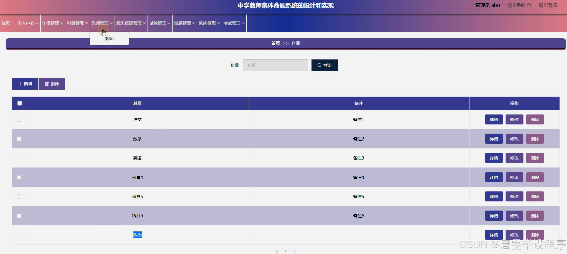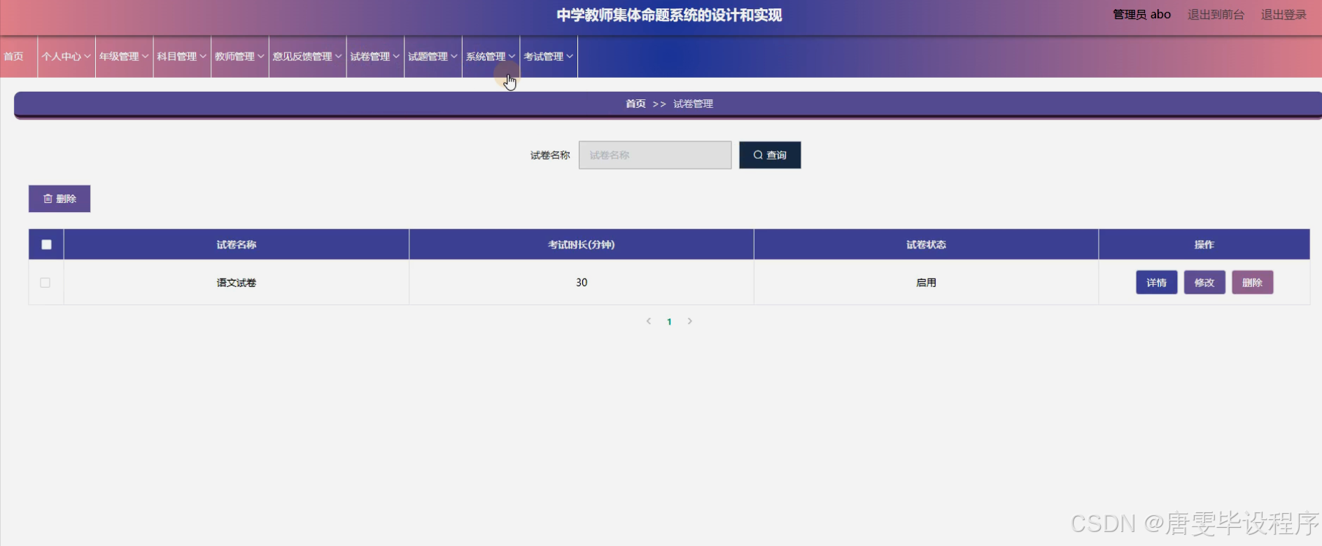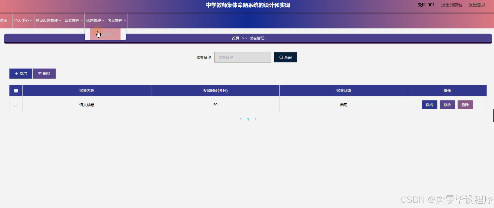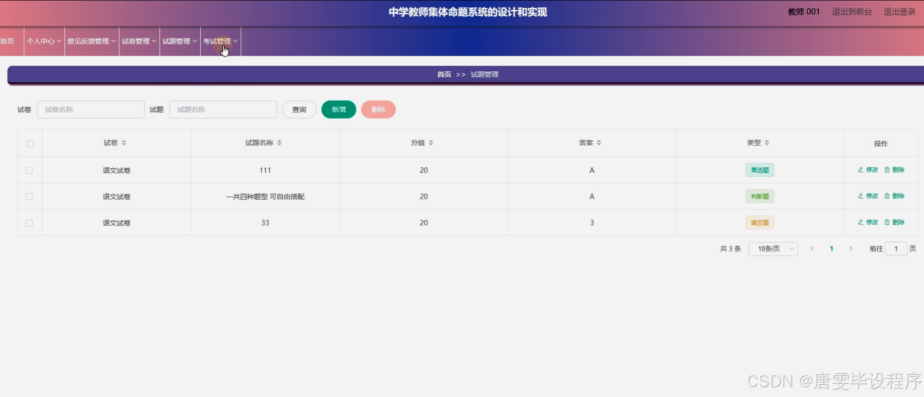 本研究的目的是设计并实现一套功能完善的中学教师集体命题系统,以提高命题效率和质量,促进教育资源的优化配置。通过该系统,教师能够方便地根据年级、科目进行命题,实现命题任务的合理分配与协作;同时,系统还能提供意见反馈功能,便于教师之间交流想法、改进试题。最终,该系统的应用将有助于提高中学教育的整体质量和效益,为学生的全面发展奠定坚实基础。
