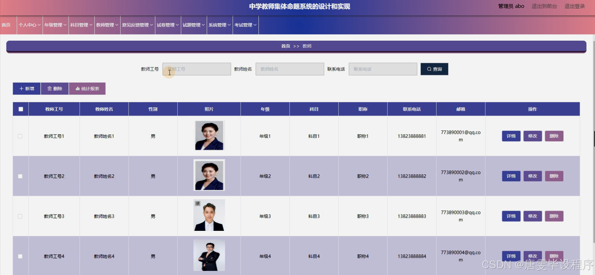本研究的核心内容在于中学教师集体命题系统的设计与实现,具体包括年级管理、科目管理、教师协作命题以及意见反馈等系统功能。年级管理模块用于设定不同年级的命题需求;科目管理模块则负责定义各科目的命题范围和标准;教师协作命题模块是实现集体命题的核心,支持教师之间的任务分配、协同编辑和试题审核;意见反馈模块则用于收集和处理教师在命题过程中的意见和建议,以促进系统的持续改进和优化。通过这些功能模块的实现,系统将能够满足中学教师集体命题的多样化需求。