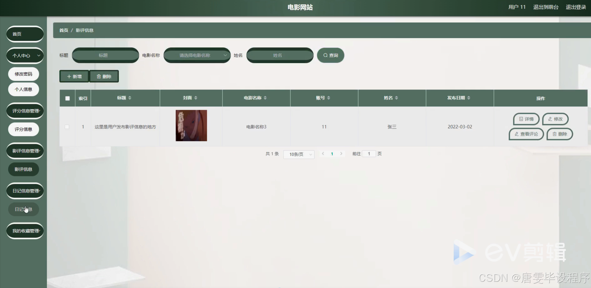本研究将围绕电影网站的核心功能展开,具体研究内容包括:用户管理系统的设计与实现,包括用户注册、登录、个人信息管理等功能;电影信息系统的构建,涵盖电影基本信息、剧情简介、演员阵容、预告片等内容;电影类型分类与筛选功能,便于用户根据喜好快速找到感兴趣的电影;评分系统的设计与实现,允许用户对电影进行评分并查看其他用户的评分情况;影评系统的开发,支持用户发布影评、点赞、回复等操作;个人日记功能的实现,允许用户记录观影心得、影评感悟等个人内容。通过这些功能的综合应用,构建一个功能全面、操作便捷的电影网站。