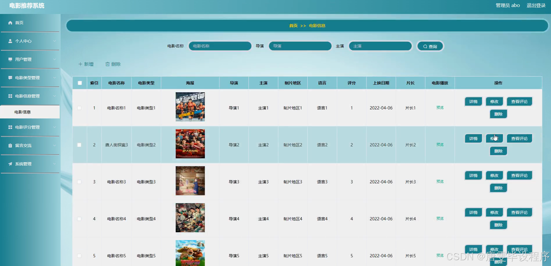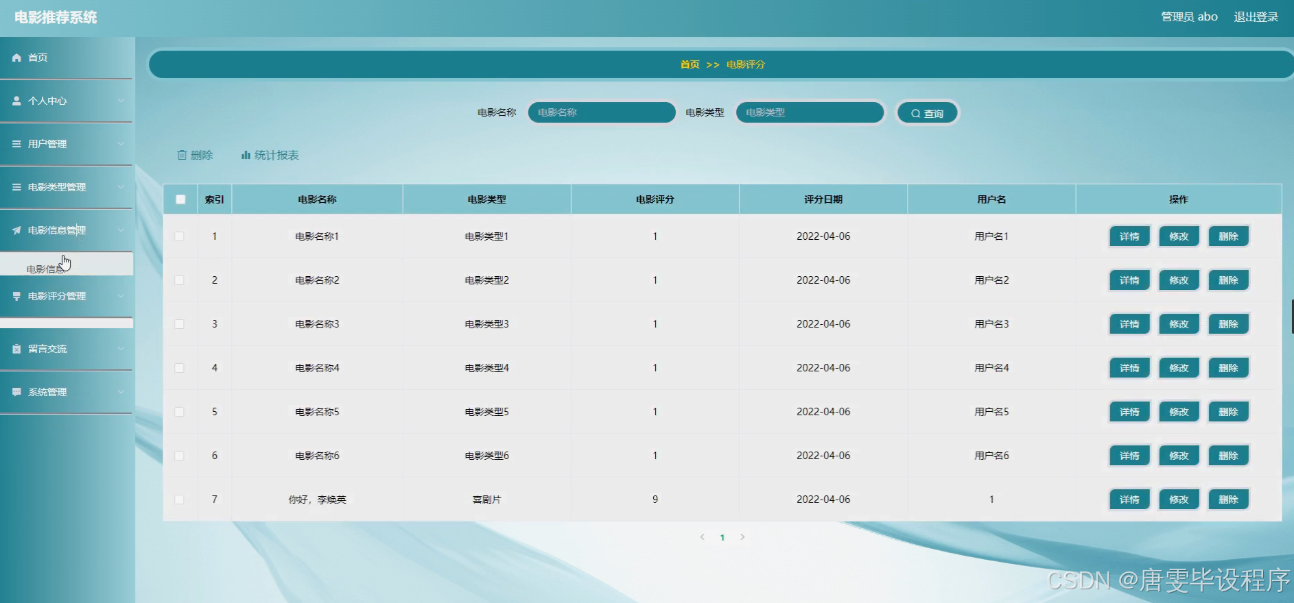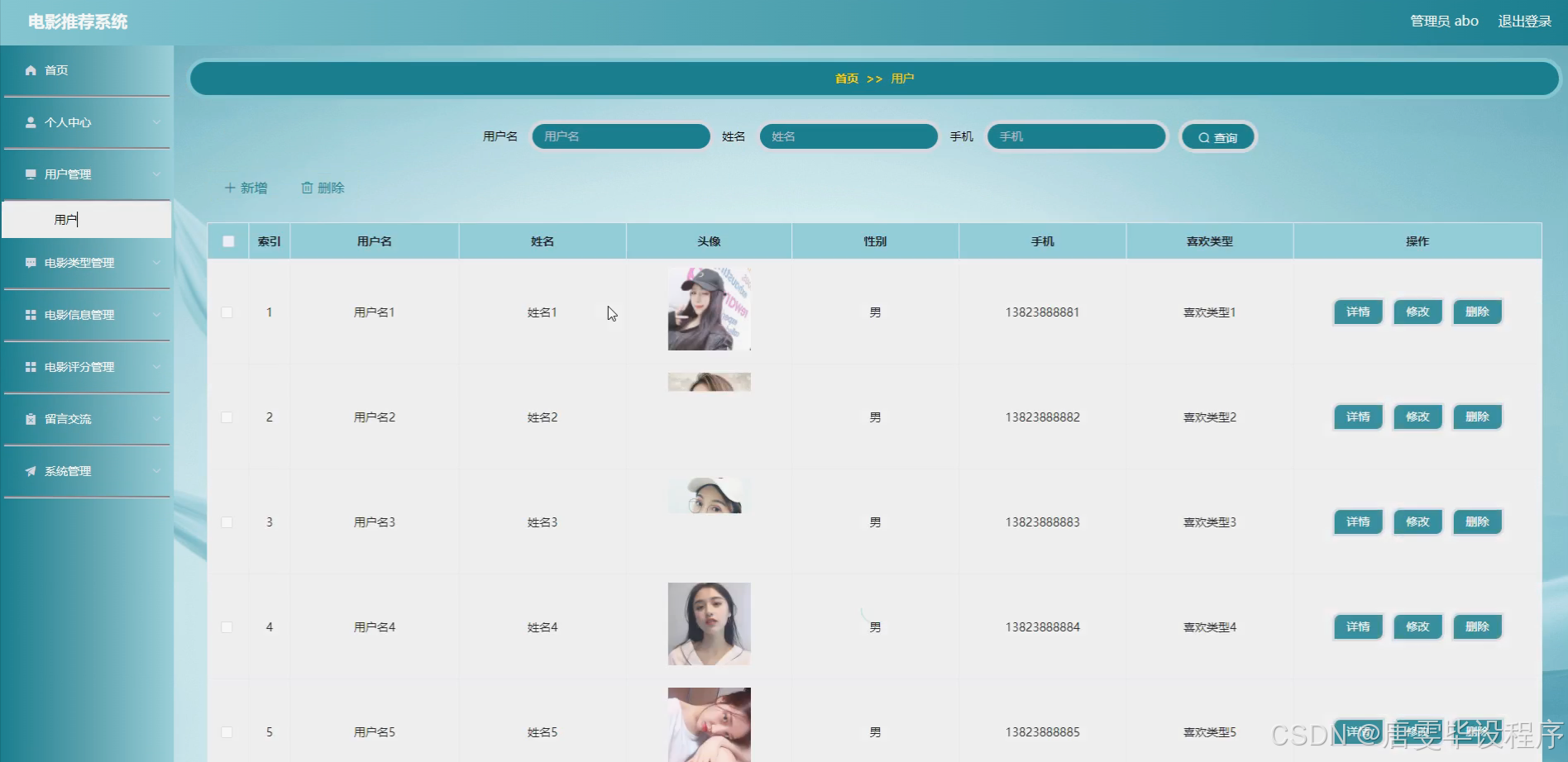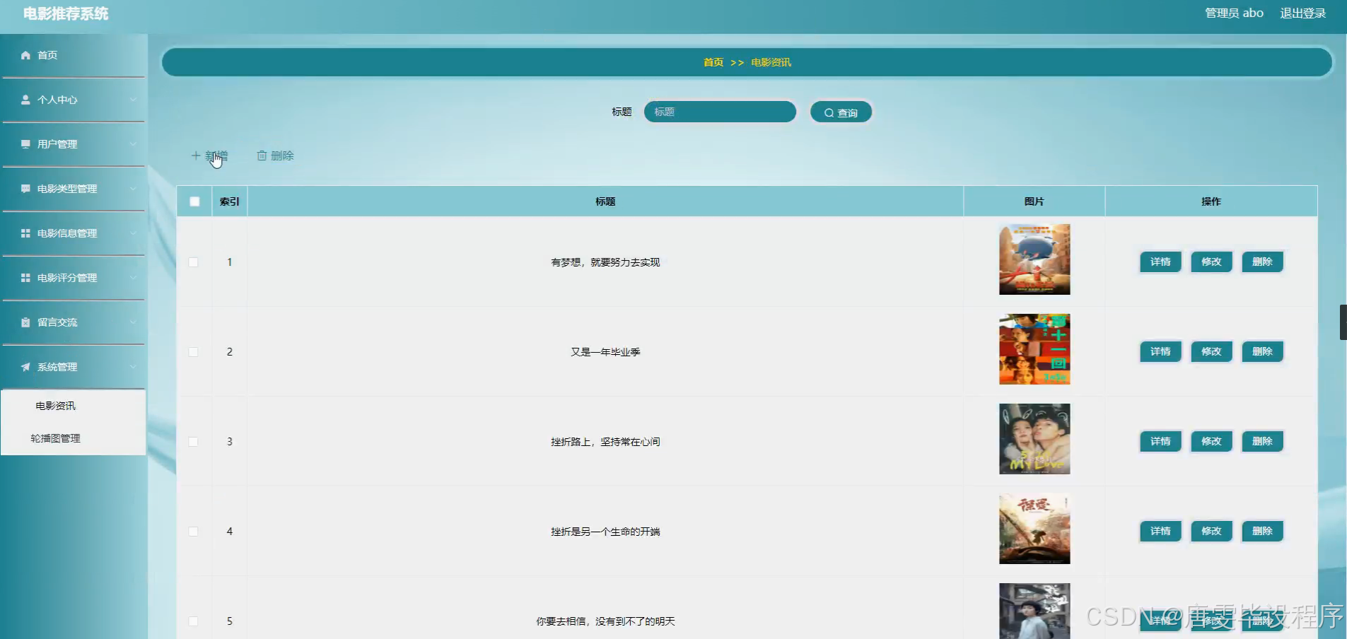 本研究旨在设计并实现一个高效、准确的电影推荐系统,以满足用户对个性化电影推荐的需求。通过整合用户信息、电影类型、电影评分及电影详情等多维度数据,构建智能化的推荐模型,为用户提供精准的电影推荐服务。同时,该系统应具备友好的用户界面和便捷的操作方式,确保用户能够轻松获取推荐结果,提升观影体验。