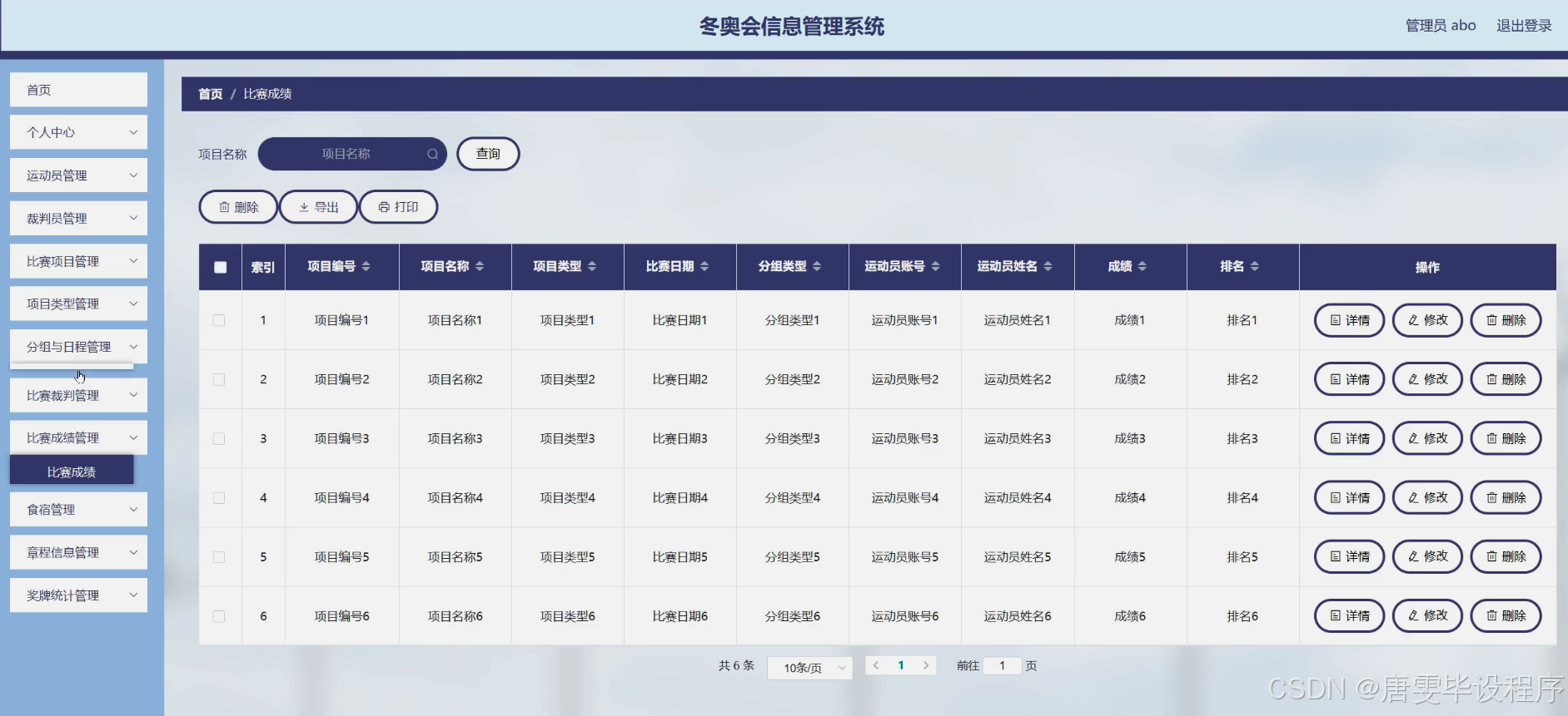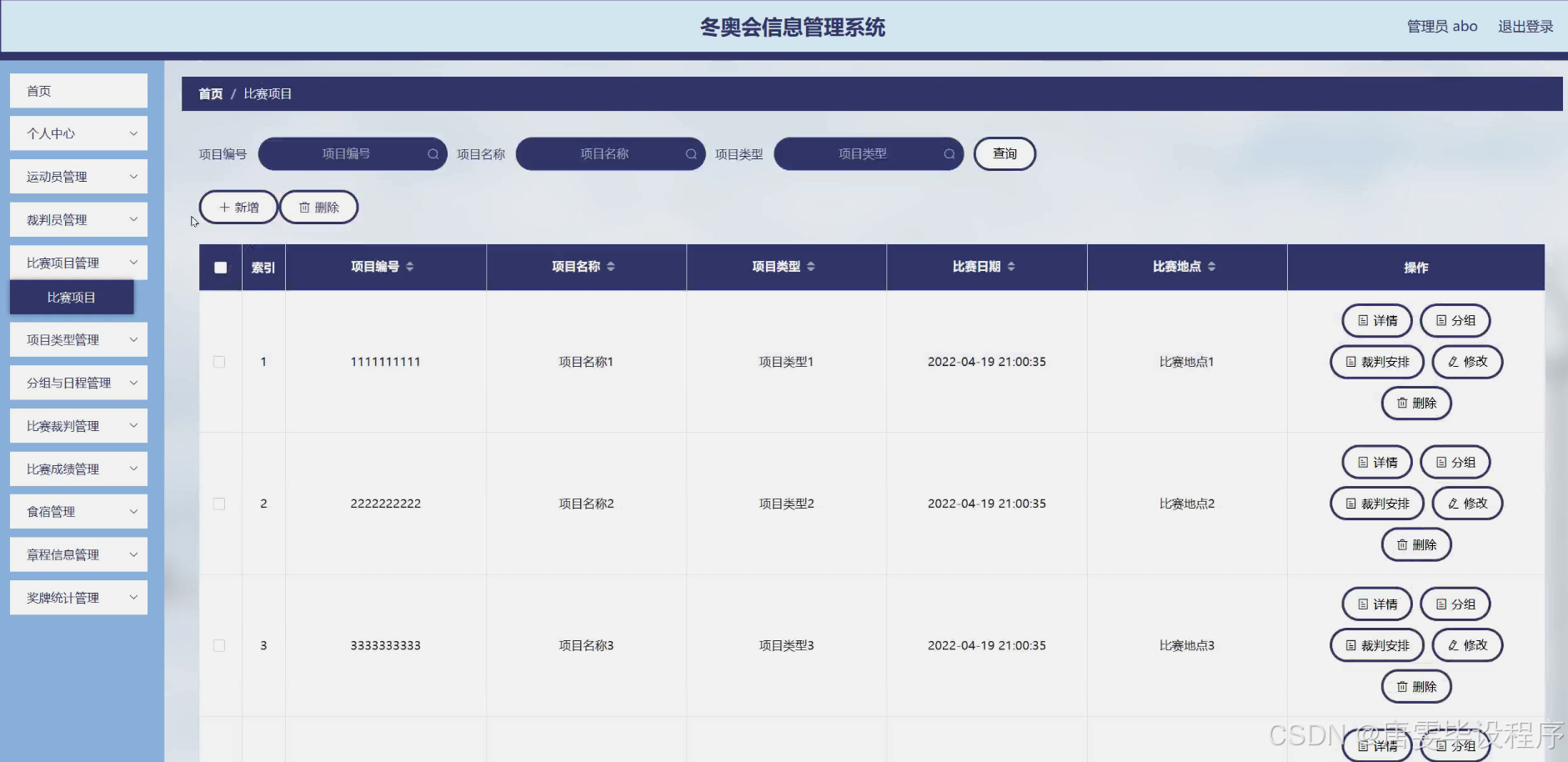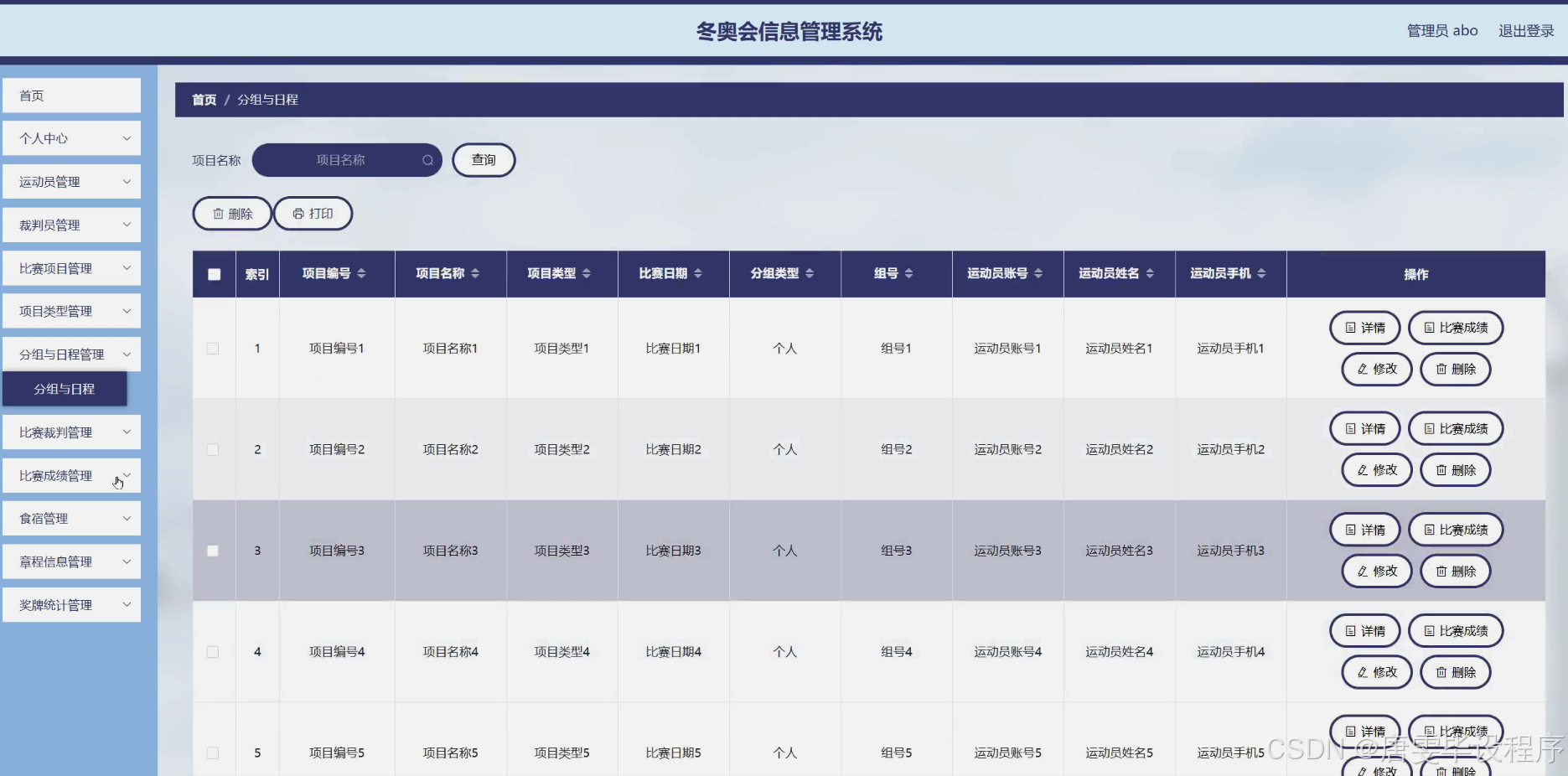 本研究旨在设计并实现一套全面、高效的冬奥会信息管理系统,以满足冬奥会组织者的多元化管理需求。通过整合运动员、裁判员、比赛项目、分组与日程、比赛裁判、比赛成绩、食宿、章程信息、奖牌统计及运动员判罚等关键功能,旨在实现信息的快速录入、查询、分析与展示,为冬奥会提供强有力的信息化支持。同时,通过系统的实际应用与反馈,不断优化完善系统功能,推动冬奥会信息管理向智能化、自动化方向发展。