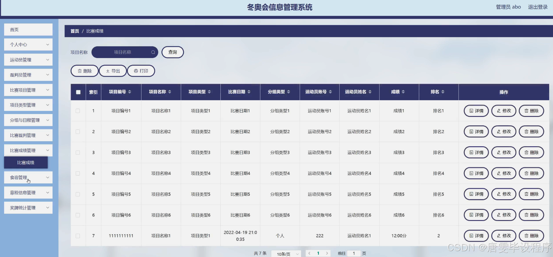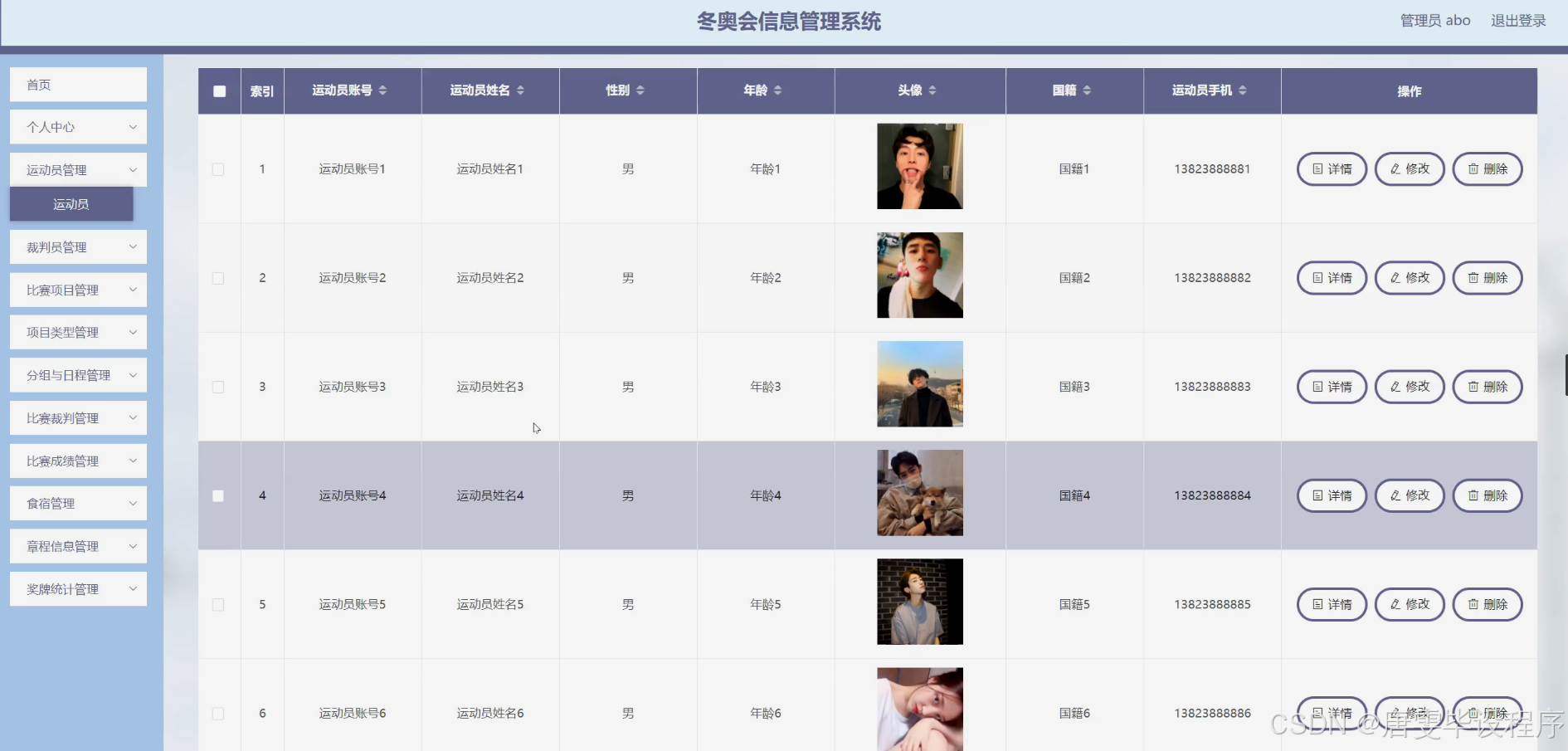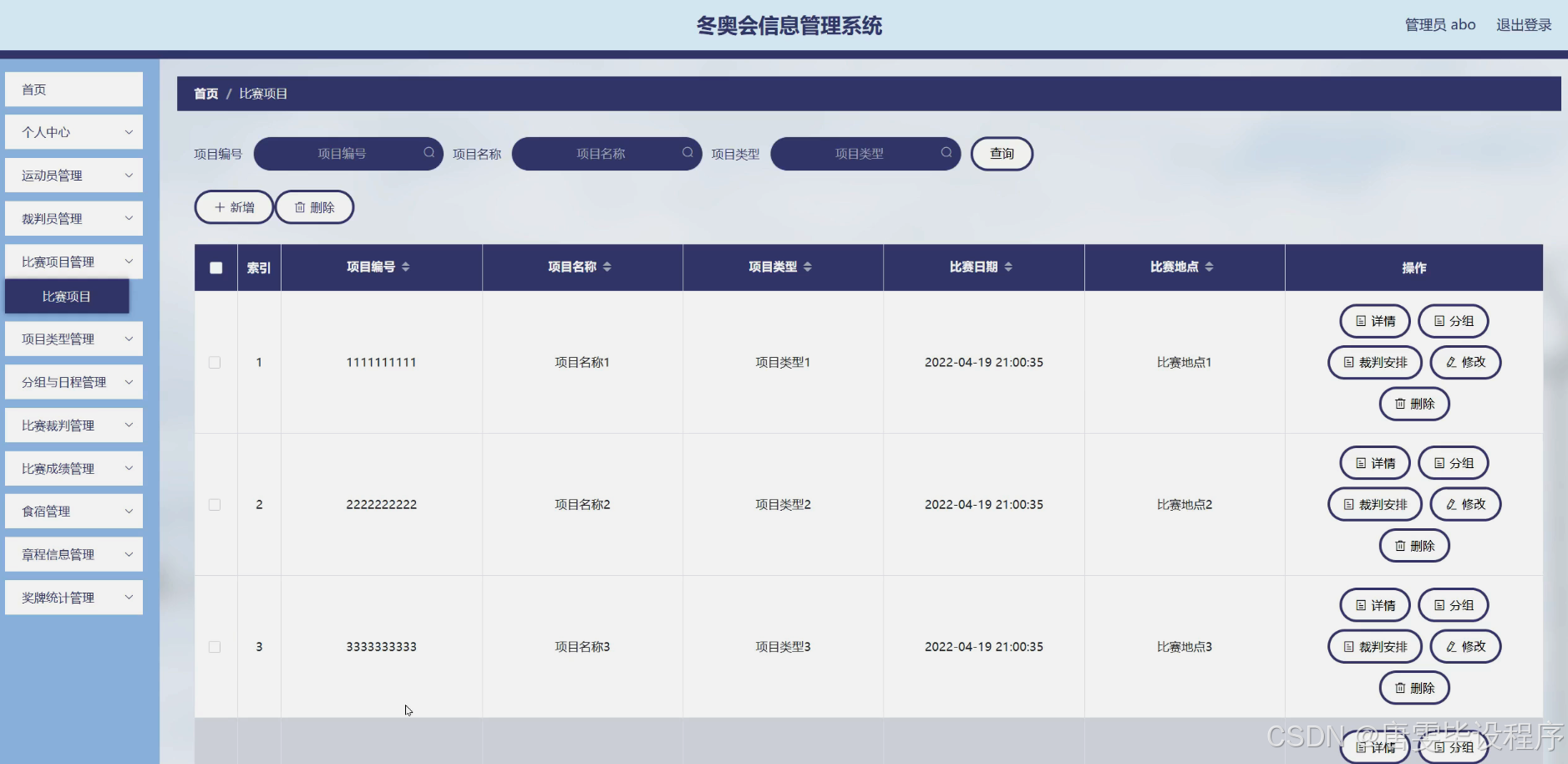 本研究旨在设计并实现一套全面、高效的冬奥会信息管理系统,以满足冬奥会组织者的多元化管理需求。通过整合运动员、裁判员、比赛项目、分组与日程、比赛裁判、比赛成绩、食宿、章程信息、奖牌统计及运动员判罚等关键功能,旨在实现信息的快速录入、查询、分析与展示,为冬奥会提供强有力的信息化支持。同时,通过系统的实际应用与反馈,不断优化完善系统功能,推动冬奥会信息管理向智能化、自动化方向发展。