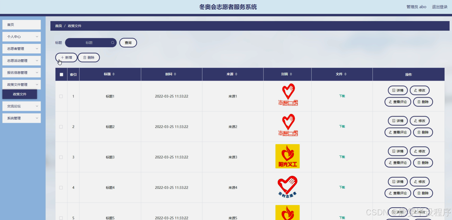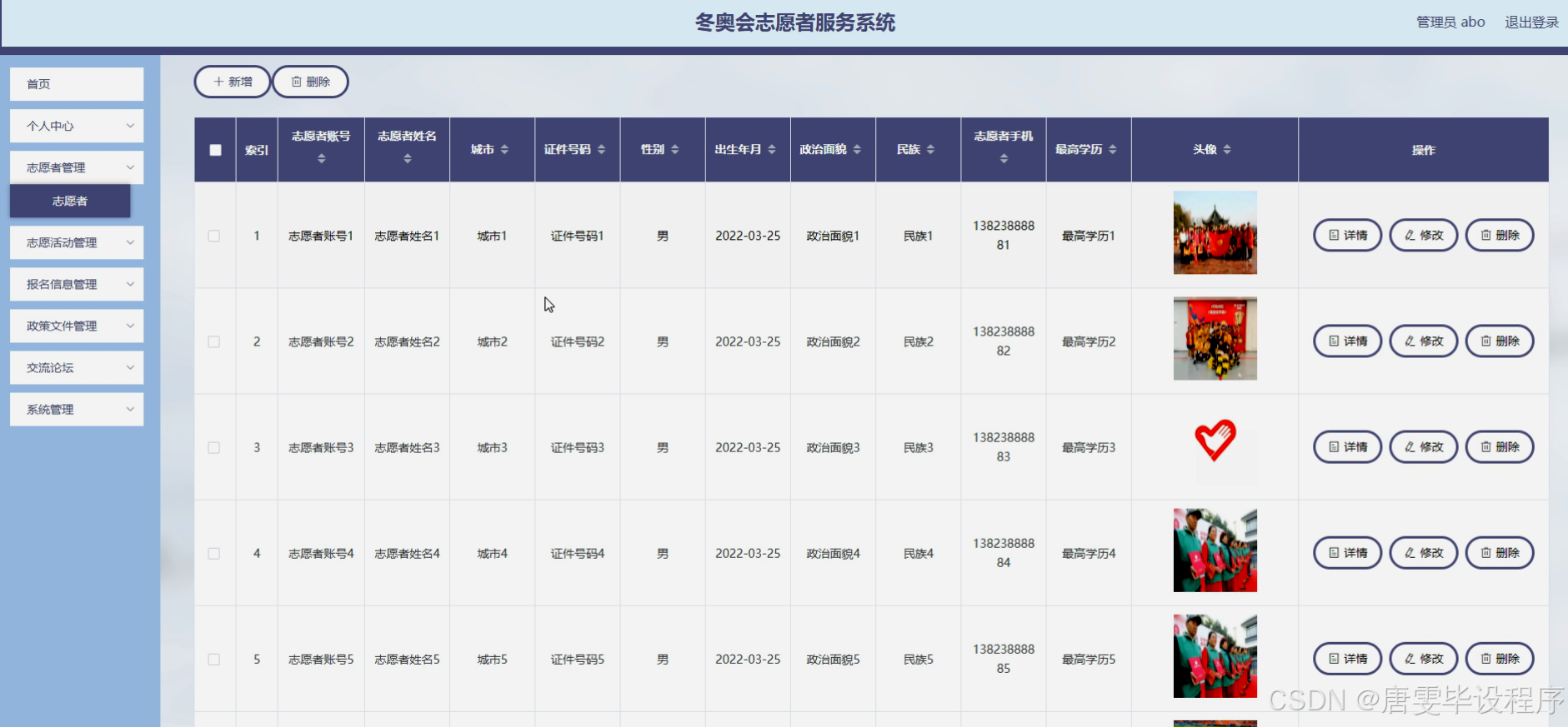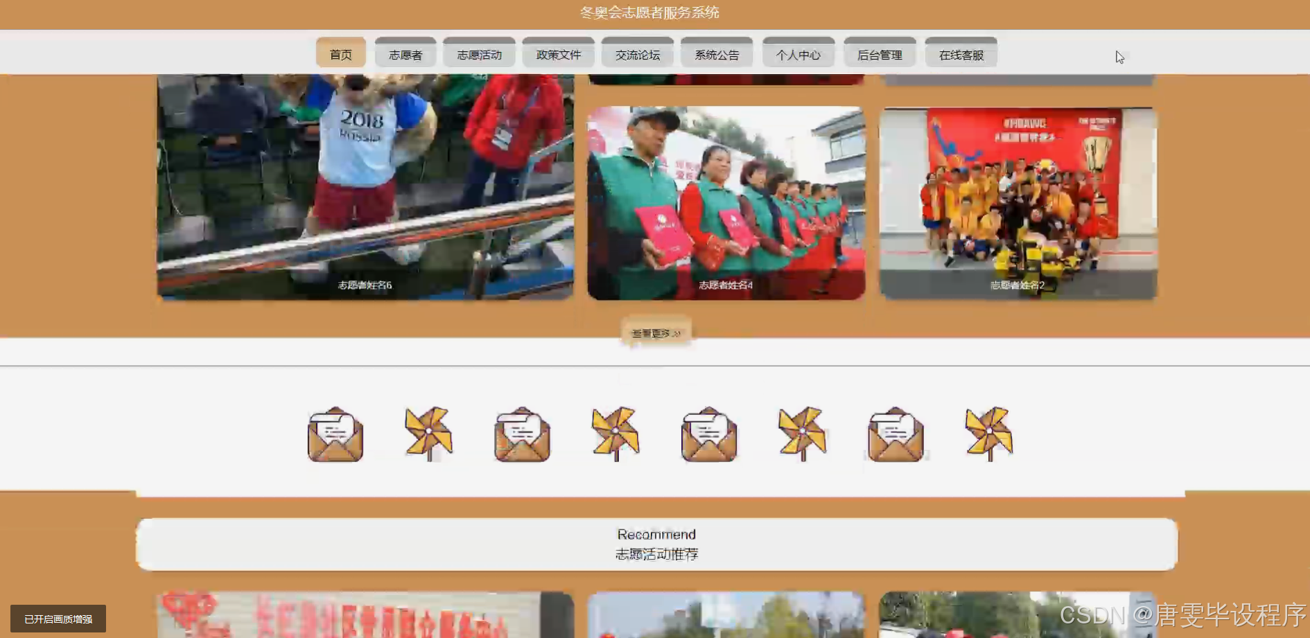 本研究旨在设计并实现一个冬奥会志愿者服务系统,通过该系统实现志愿者的招募、培训、活动安排、报名信息管理以及政策文件发布等功能,以提高志愿者的服务质量和效率,确保冬奥会的成功举办。同时,通过该系统的应用,探索体育赛事志愿者服务的新模式和新方法,为未来的体育赛事志愿者服务提供有益的参考和借鉴。
