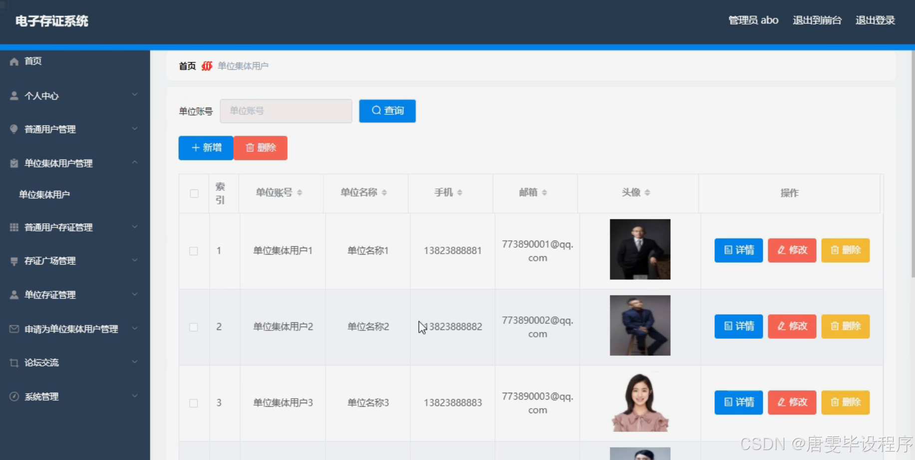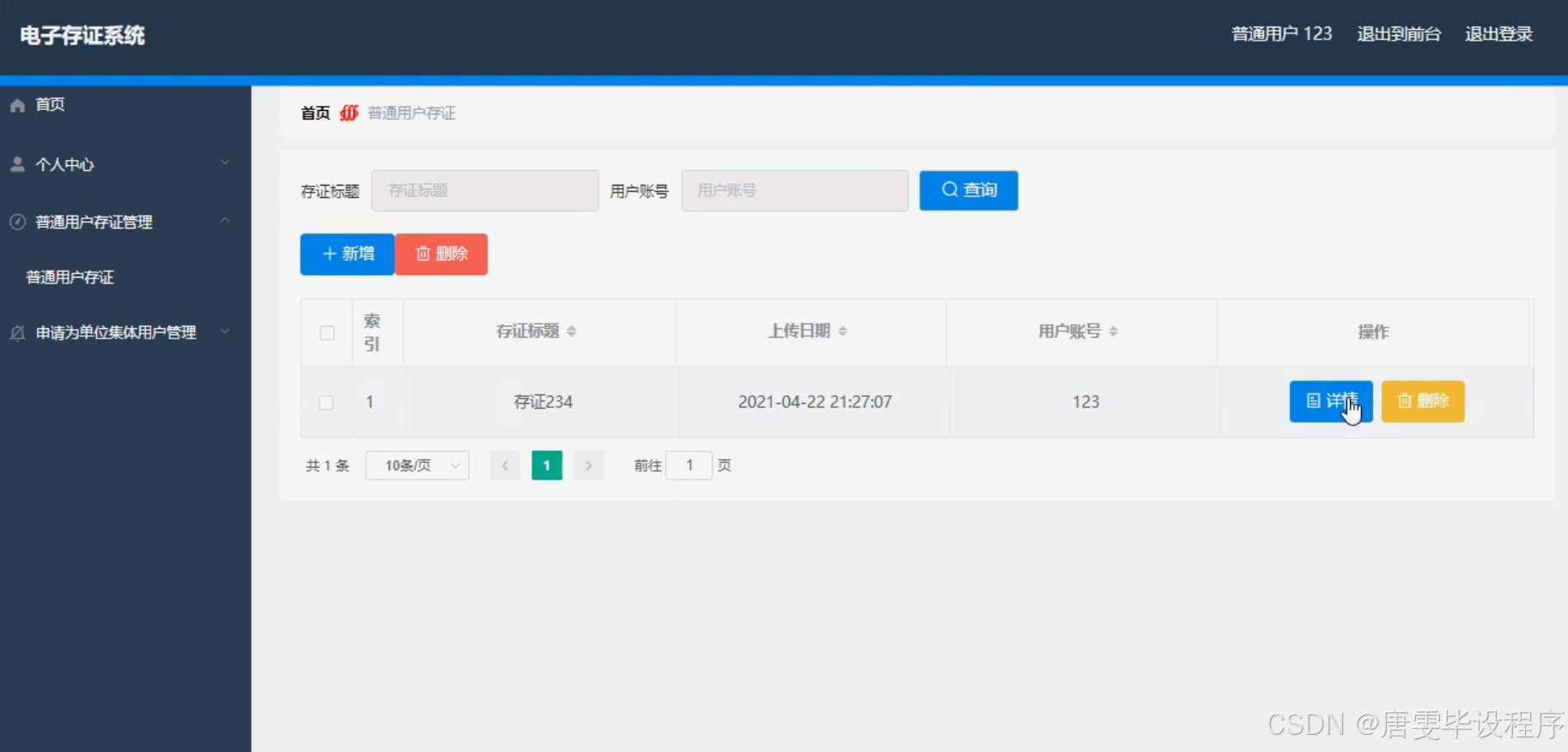 在系统设计上,充分考虑普通用户和单位集体用户的差异化需求,设计用户注册、登录、权限管理等基础功能,确保系统的易用性和安全性。针对普通用户,提供便捷的电子数据上传、存证功能,支持多种格式的文件存证,如文档、图片、视频等,同时提供存证证书生成与下载服务,确保用户能够随时获取到具有法律效力的存证证明。在存证广场模块,用户可浏览公开的存证信息,增强信息的透明度与公信力。