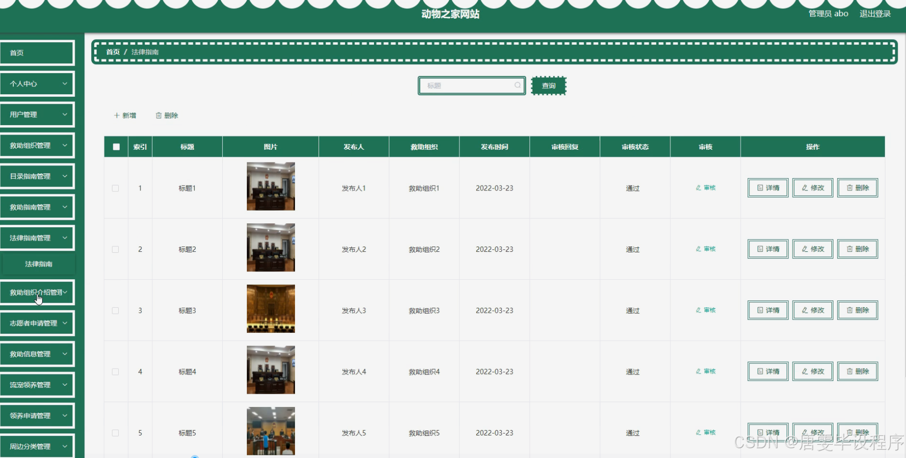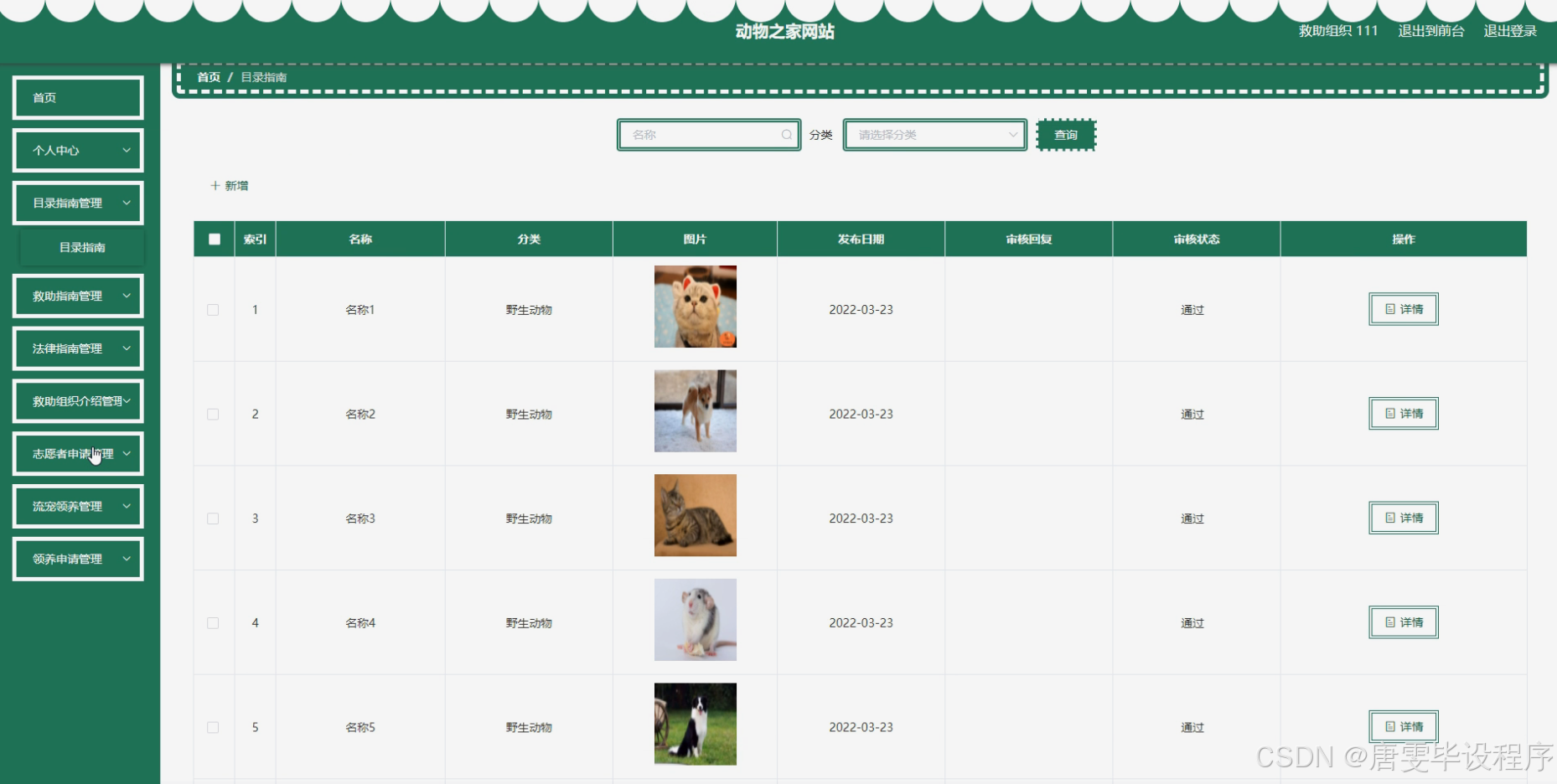 动物之家网站的研究内容围绕其核心功能展开,具体包括:用户系统的设计与实现,确保用户信息安全与个性化体验;救助组织模块,详细介绍各组织背景、救助成果及联系方式,便于公众了解与支持;目录指南与救助指南模块,提供详尽的操作流程与注意事项,指导用户正确参与救助活动;法律指南模块,解读相关法律法规,保障救助活动的合法性;救助组织介绍与志愿者申请系统,搭建救助组织与志愿者之间的桥梁,促进人力资源的有效配置;救助信息发布与流宠领养申请系统,实现救助信息的即时更新与领养流程的线上化;周边分类与周边商城模块,提供宠物用品、服务等相关信息,丰富用户体验,形成良性循环的动物保护生态。通过这些功能模块的深入研发与优化,动物之家网站将成为推动动物保护事业发展的重要力量。