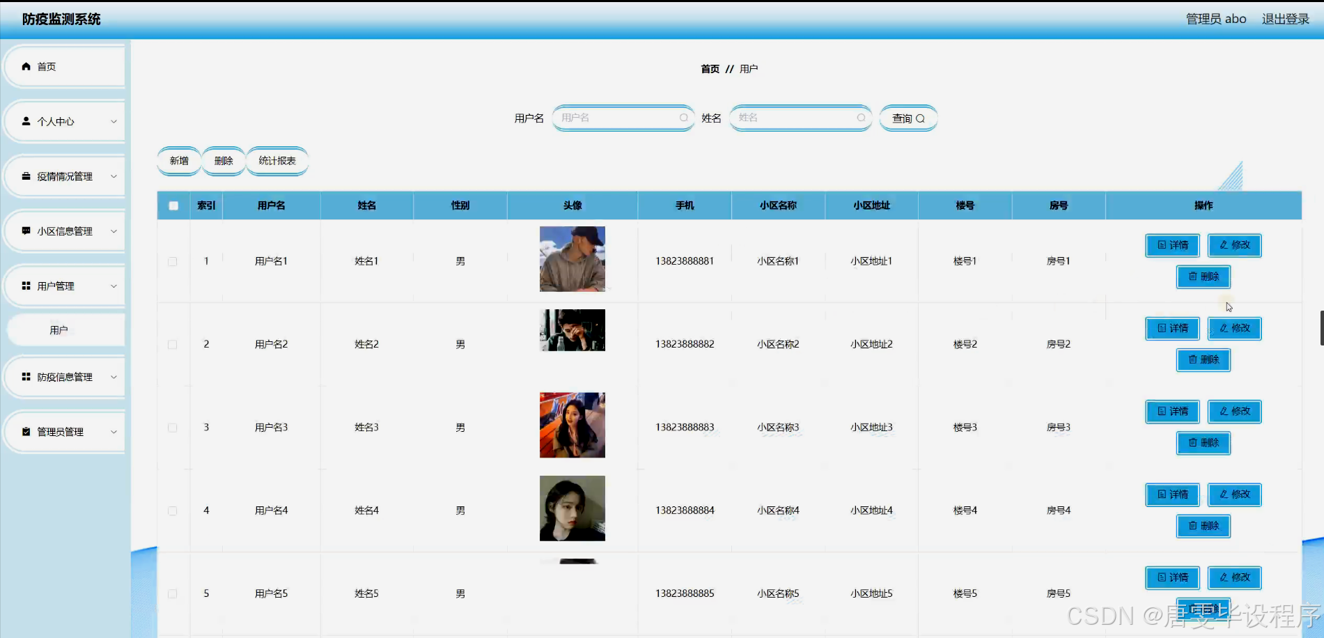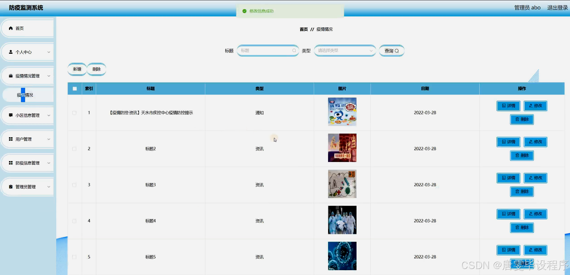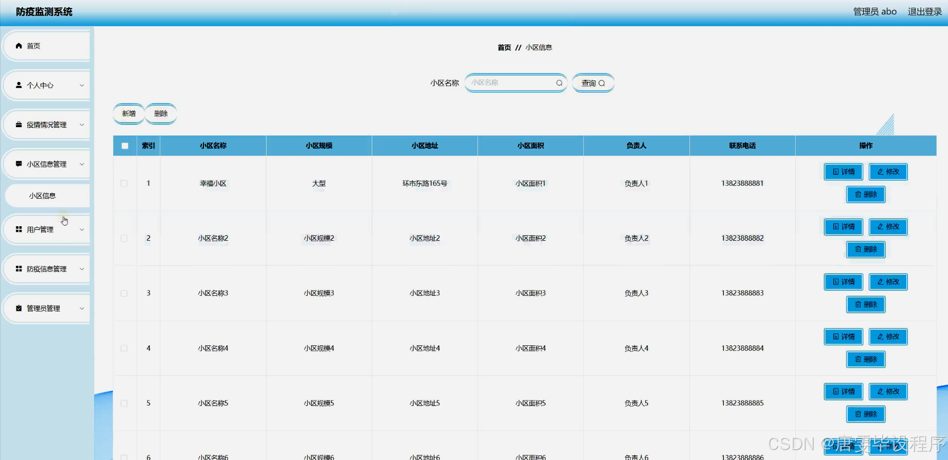 防疫监测系统的研究内容主要包括疫情情况监测、小区信息管理、用户信息管理和防疫信息发布等功能模块。疫情情况监测模块能够实时收集和分析疫情数据,包括确诊病例、疑似病例、死亡病例等关键信息,为决策者提供科学依据;小区信息管理模块能够对小区进行精细化管理,包括小区基本信息、居民健康状况、出入人员登记等;用户信息管理模块能够记录用户的基本信息、健康状况和防疫行为,为用户提供个性化的防疫建议;防疫信息发布模块能够实时发布最新的防疫政策、健康知识和防控措施,提高公众的防疫意识和参与度。通过这些功能模块,防疫监测系统能够实现对疫情数据的全面监控和分析,为疫情防控提供有力的技术支撑。