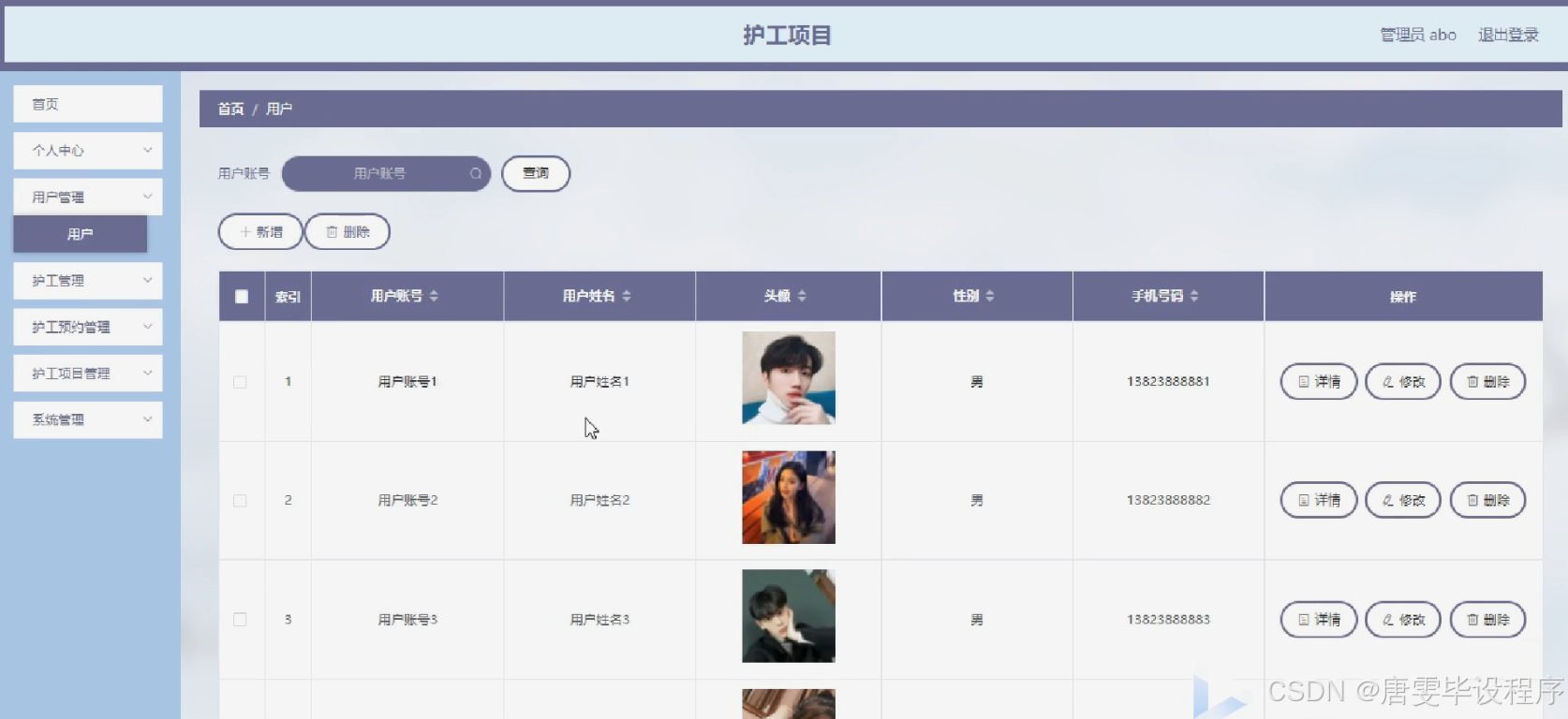 本研究的主要目的是设计并开发一个功能完善的护工项目平台,以满足用户多样化的护理需求。通过该平台,用户可以方便地查看护工信息、预约服务,并对服务进行评价和反馈;护工则可以通过平台接单、提供服务,并管理自己的个人信息和工作日程。此外,平台还将提供护工项目管理功能,以确保各项服务的有序进行和高质量完成。通过本研究,我们期望能够为用户和护工搭建一个高效、便捷、可靠的沟通和服务桥梁。