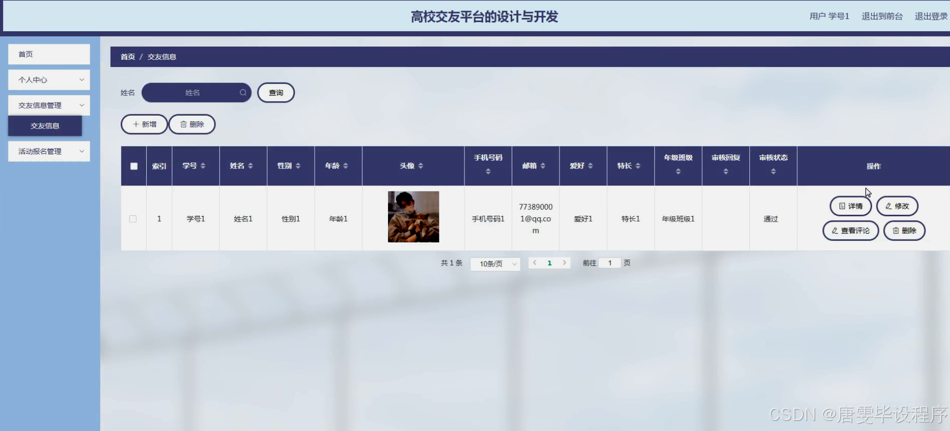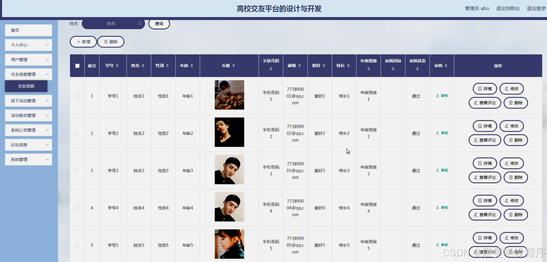 本研究旨在设计并开发一个功能完善、操作简便、安全可靠的高校交友平台,以满足学生多样化的交友需求。通过整合用户管理、交友信息发布、线下活动策划与报名、系统公告发布等核心功能,该平台将为学生提供一个集线上交流与线下互动于一体的全方位社交体验。同时,本研究还将探索如何运用现代技术手段提升平台的用户体验和安全性,确保学生在享受交友乐趣的同时,能够保护个人隐私和信息安全。