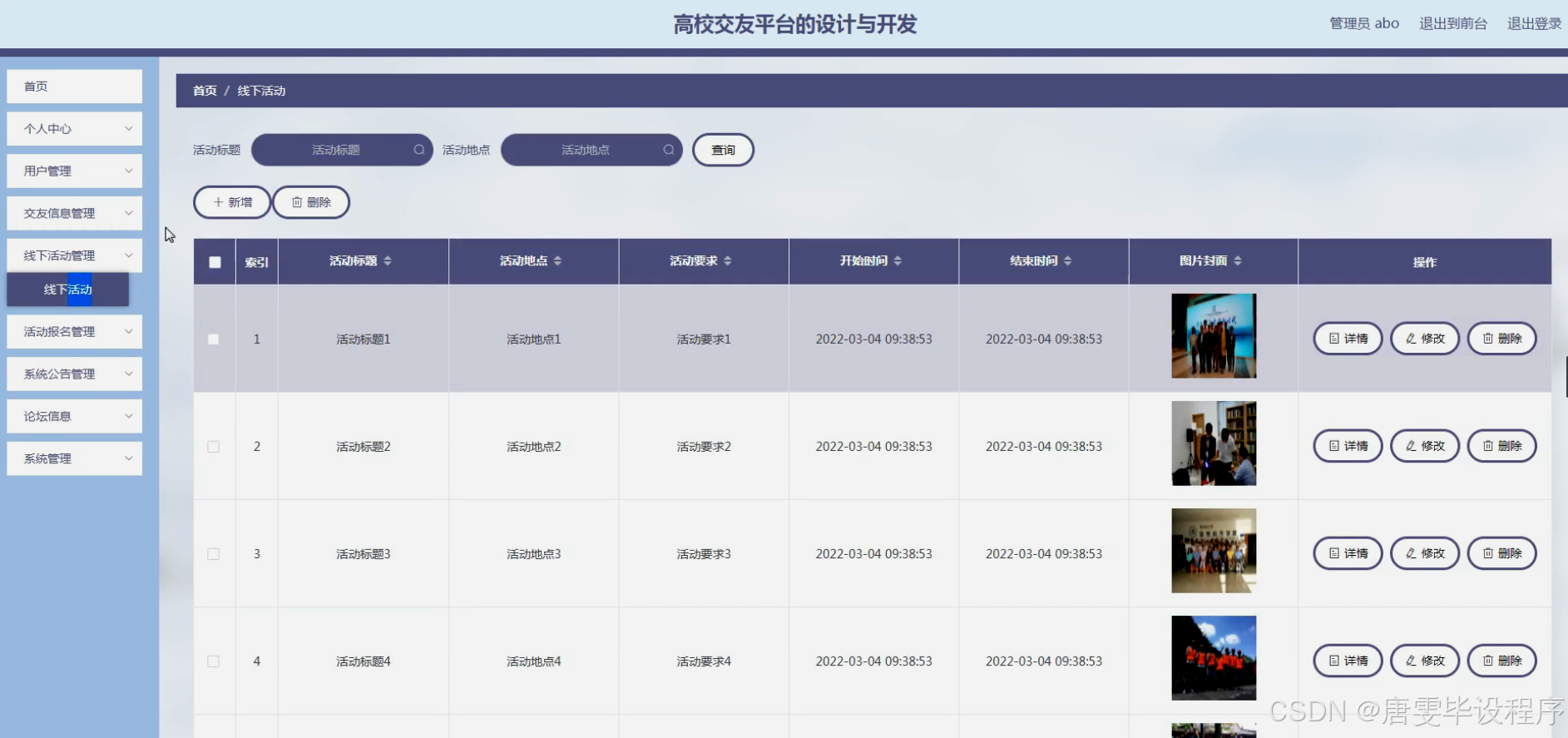 本研究将围绕高校交友平台的核心功能展开,具体包括用户管理模块、交友信息管理模块、线下活动管理模块、活动报名管理模块以及系统公告管理模块。用户管理模块负责用户的注册、登录、个人信息维护以及权限管理等功能;交友信息管理模块允许用户发布个人交友信息,包括兴趣爱好、性格特点、交友期望等,并支持信息的搜索与匹配;线下活动管理模块则负责活动的创建、发布、修改与删除等操作,同时提供活动地点的选择和时间安排功能;活动报名管理模块允许用户浏览活动信息,并根据个人兴趣进行报名;系统公告管理模块则用于发布平台的重要通知和更新信息,确保用户能够及时了解平台的最新动态。通过这些功能模块的设计与开发,本研究将致力于打造一个功能全面、操作便捷、安全可靠的高校交友平台。