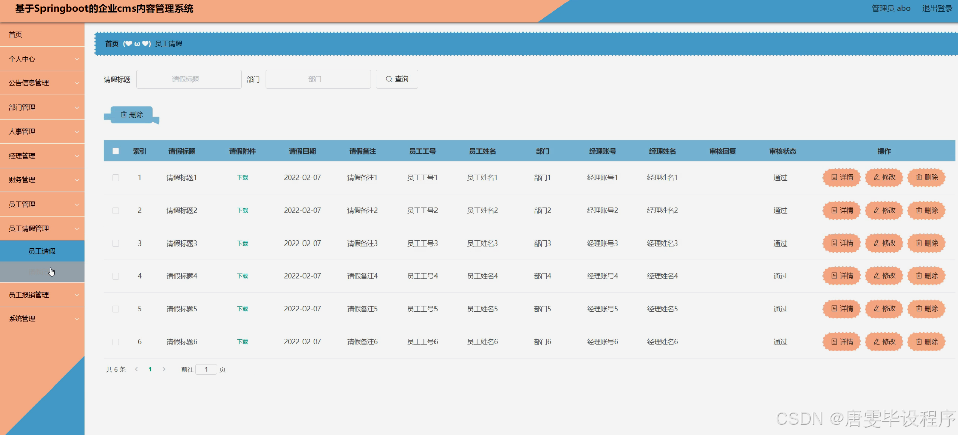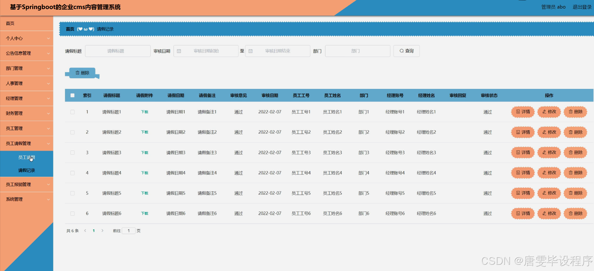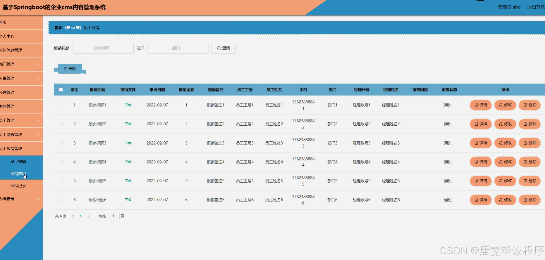 本毕业设计的研究内容围绕企业CMS内容管理系统的核心功能展开,具体包括:公告信息模块,用于发布企业内部的各类通知和公告;部门管理模块,实现对企业组织架构的灵活配置;人事管理模块,涵盖员工信息管理、入职离职管理等;经理审批模块,支持对请假、报销等事务的在线审批;财务管理模块,记录员工报销申请及复审情况,形成报销记录;员工请假模块,允许员工在线提交请假申请,查看请假记录;文件信息管理模块,提供文件的上传、下载、共享等功能。通过这些功能模块的设计与实施,构建一个功能齐全、易于操作的企业CMS系统,以满足企业日常运营和管理的需求。