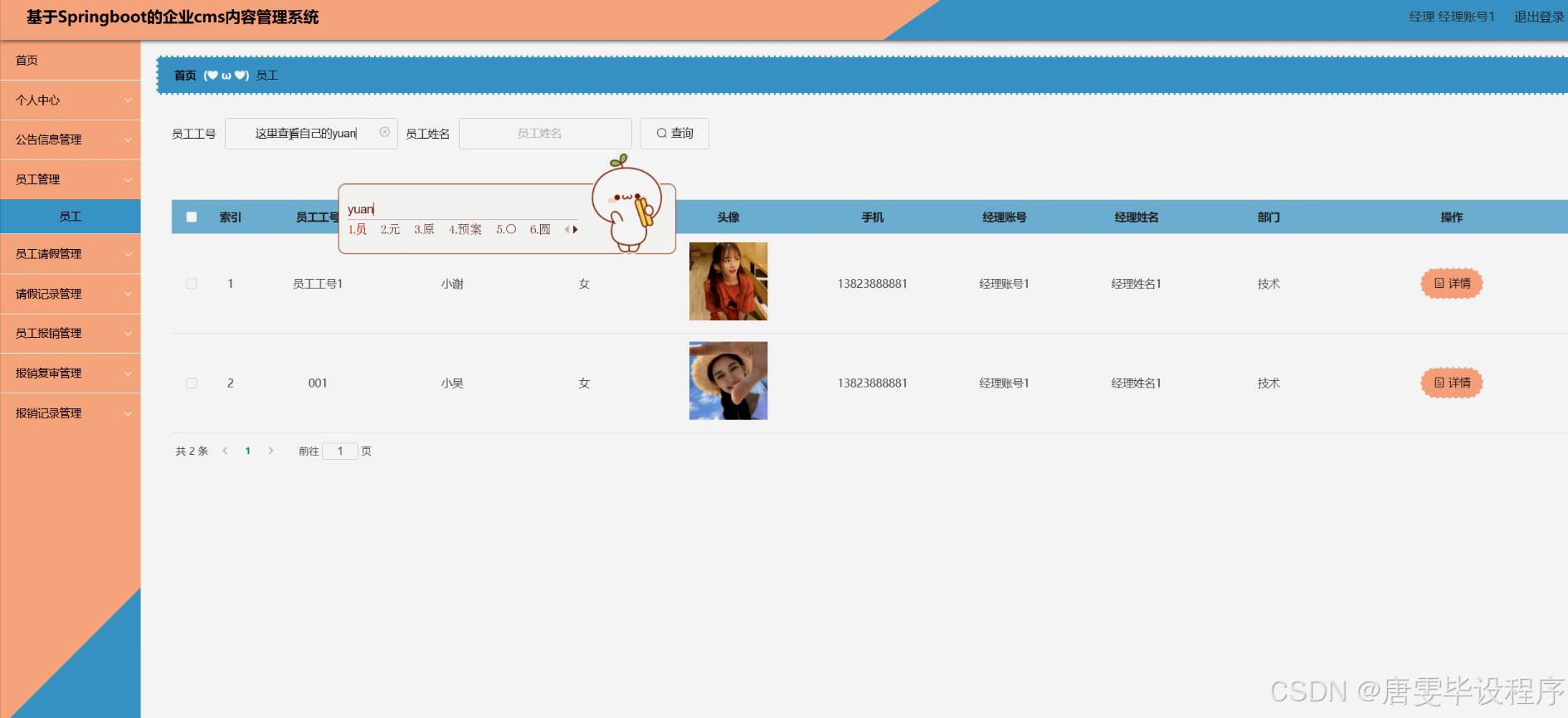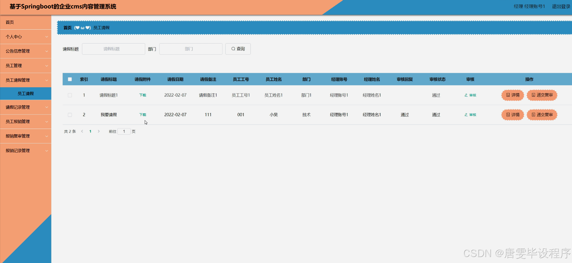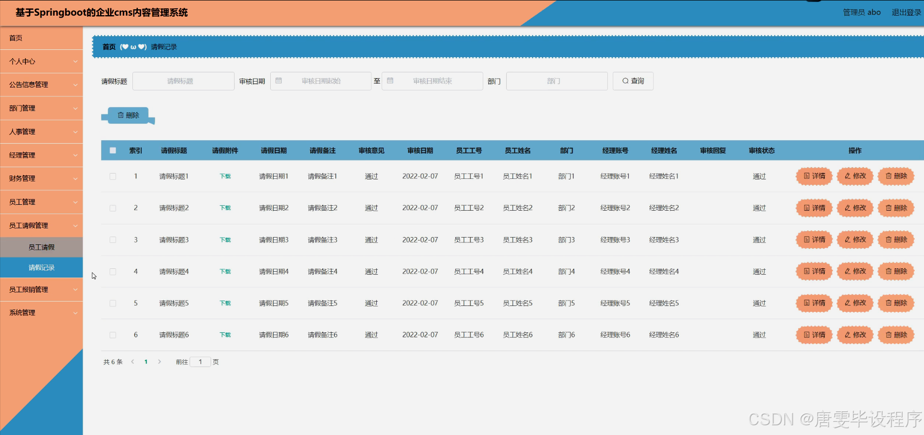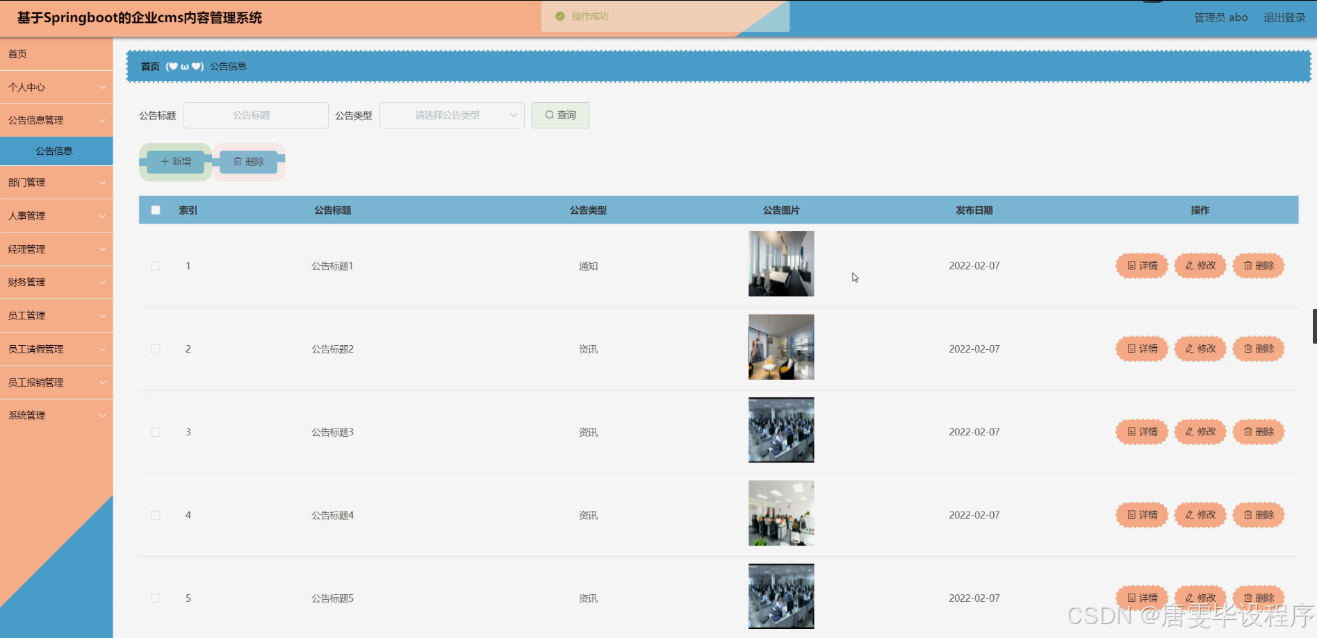 本毕业设计的研究内容围绕企业CMS内容管理系统的核心功能展开,具体包括:公告信息模块,用于发布企业内部的各类通知和公告;部门管理模块,实现对企业组织架构的灵活配置;人事管理模块,涵盖员工信息管理、入职离职管理等;经理审批模块,支持对请假、报销等事务的在线审批;财务管理模块,记录员工报销申请及复审情况,形成报销记录;员工请假模块,允许员工在线提交请假申请,查看请假记录;文件信息管理模块,提供文件的上传、下载、共享等功能。通过这些功能模块的设计与实施,构建一个功能齐全、易于操作的企业CMS系统,以满足企业日常运营和管理的需求。