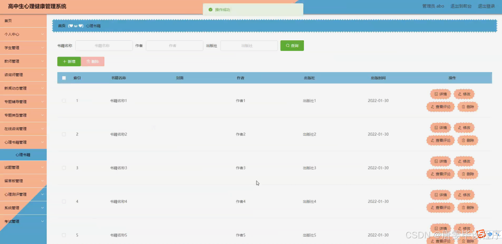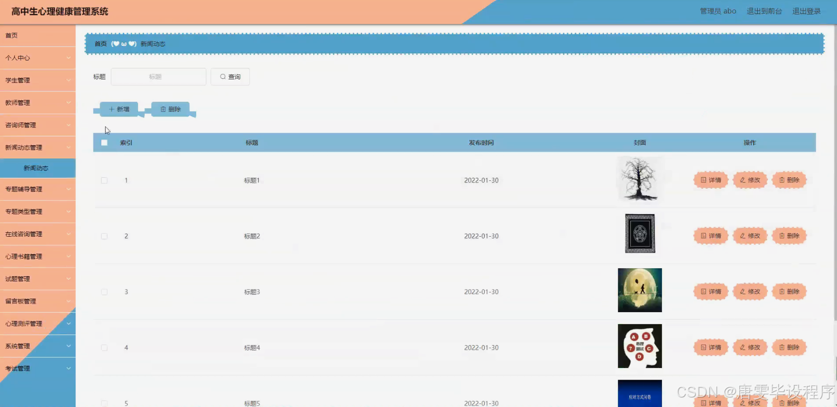 高中生心理健康管理系统将围绕学生、教师、咨询师三大核心用户群体,构建包含新闻动态、专题辅导、专题类型、在线咨询、心理书籍等多功能模块的系统架构。具体而言,学生模块将提供心理健康自评量表、成长日记记录、心理健康资源浏览等功能,帮助学生自我认知与成长;教师模块则侧重于学生心理健康数据的可视化展示、异常预警通知及心理辅导计划的制定;咨询师模块将集成在线咨询管理、心理测试量表库、案例库与书籍推荐等功能,以支持专业高效的心理健康服务。此外,新闻动态模块将发布心理健康相关的最新资讯,增强学生的心理健康意识;专题辅导与专题类型模块则根据热点心理问题设计系列课程和活动,提供针对性的辅导资源。通过这些功能模块的综合运用,系统将实现对学生心理健康状况的全方位监测与个性化干预,促进学生心理健康水平的提升。