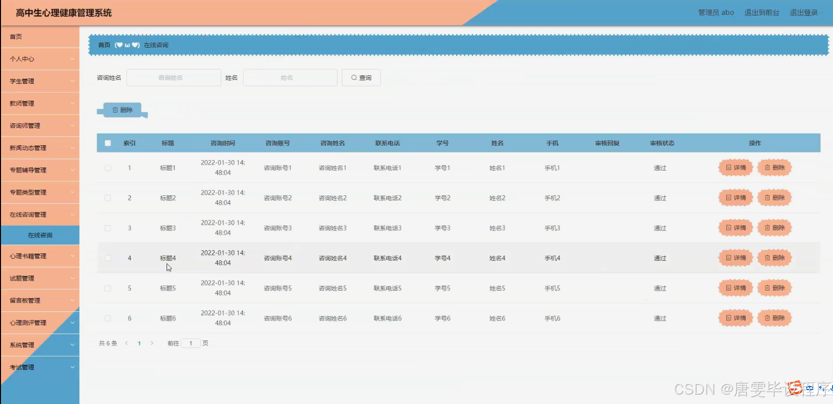 本研究旨在设计并实现一套功能完善、操作便捷的高中生心理健康管理系统,以满足学生、教师、心理咨询师等不同角色的需求。通过该系统,学生可以获得个性化的心理健康评估、专题辅导资源和在线咨询服务;教师可以便捷地掌握学生的心理状况,进行针对性的心理辅导;心理咨询师则能利用系统进行高效的在线咨询和心理书籍推荐,提升心理健康服务的专业性和覆盖面。最终,通过该系统的应用,期望能够显著提高学生的心理健康水平,为培养身心健康、全面发展的社会主义建设者和接班人贡献力量。