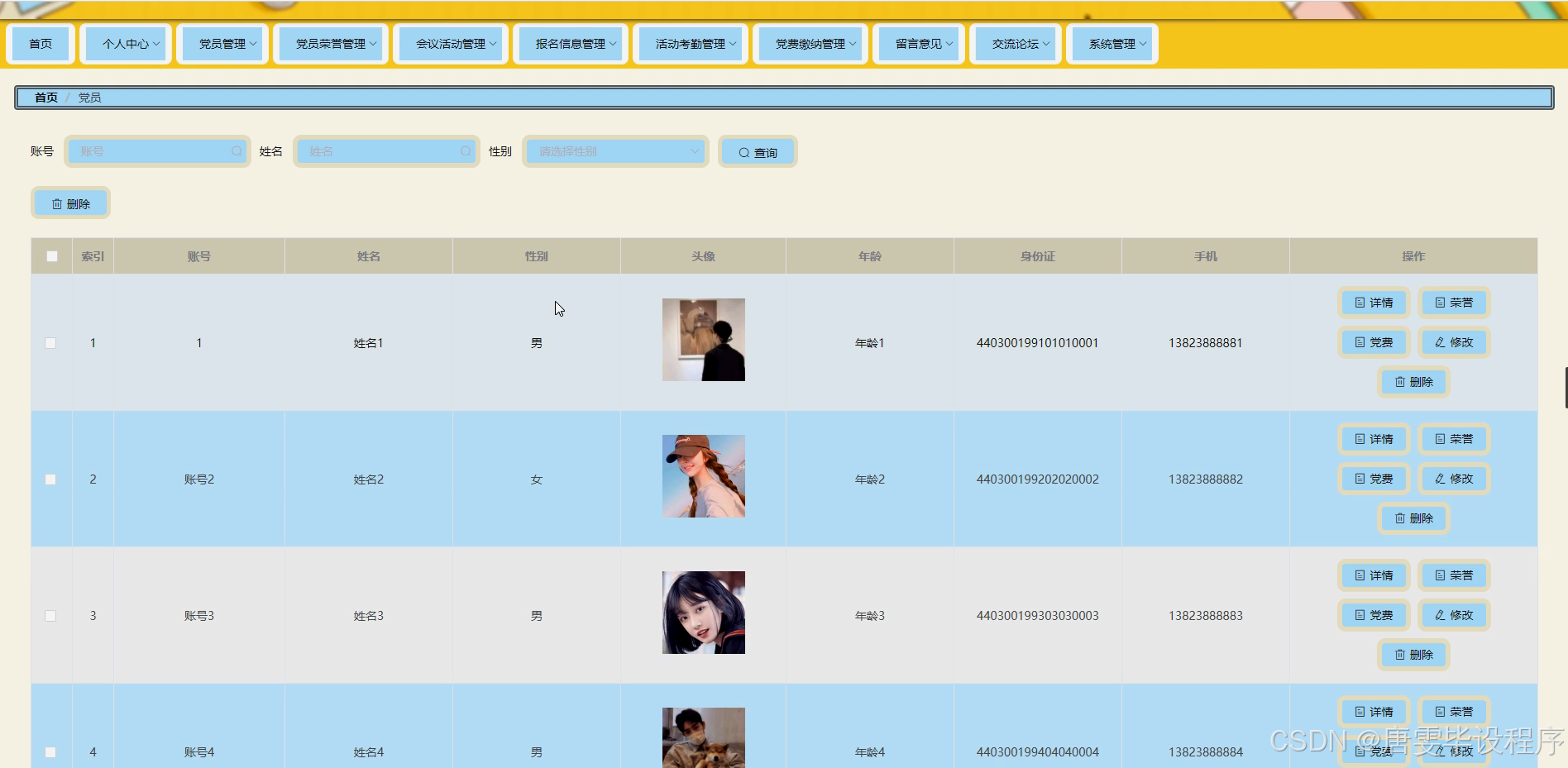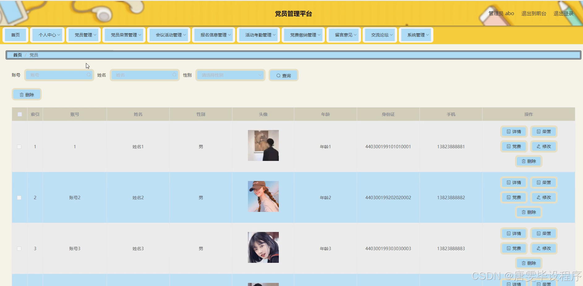 随着信息技术的飞速发展和党建工作的不断深入,传统的党员管理方式已难以满足新时代的需求。党员作为党的肌体的细胞,其管理效率与质量直接关系到党的凝聚力和战斗力。当前,部分党组织在党员管理上存在信息更新不及时、活动组织不便捷、党费缴纳不透明等问题,这些问题不仅影响了党员参与组织生活的积极性,也制约了党组织功能的充分发挥。因此,开发一个集党员信息管理、会议活动组织、报名信息统计、党费缴纳记录、活动考勤跟踪及党员荣誉展示等功能于一体的党员管理平台,成为提升党员管理效能、促进党建工作信息化的重要手段。