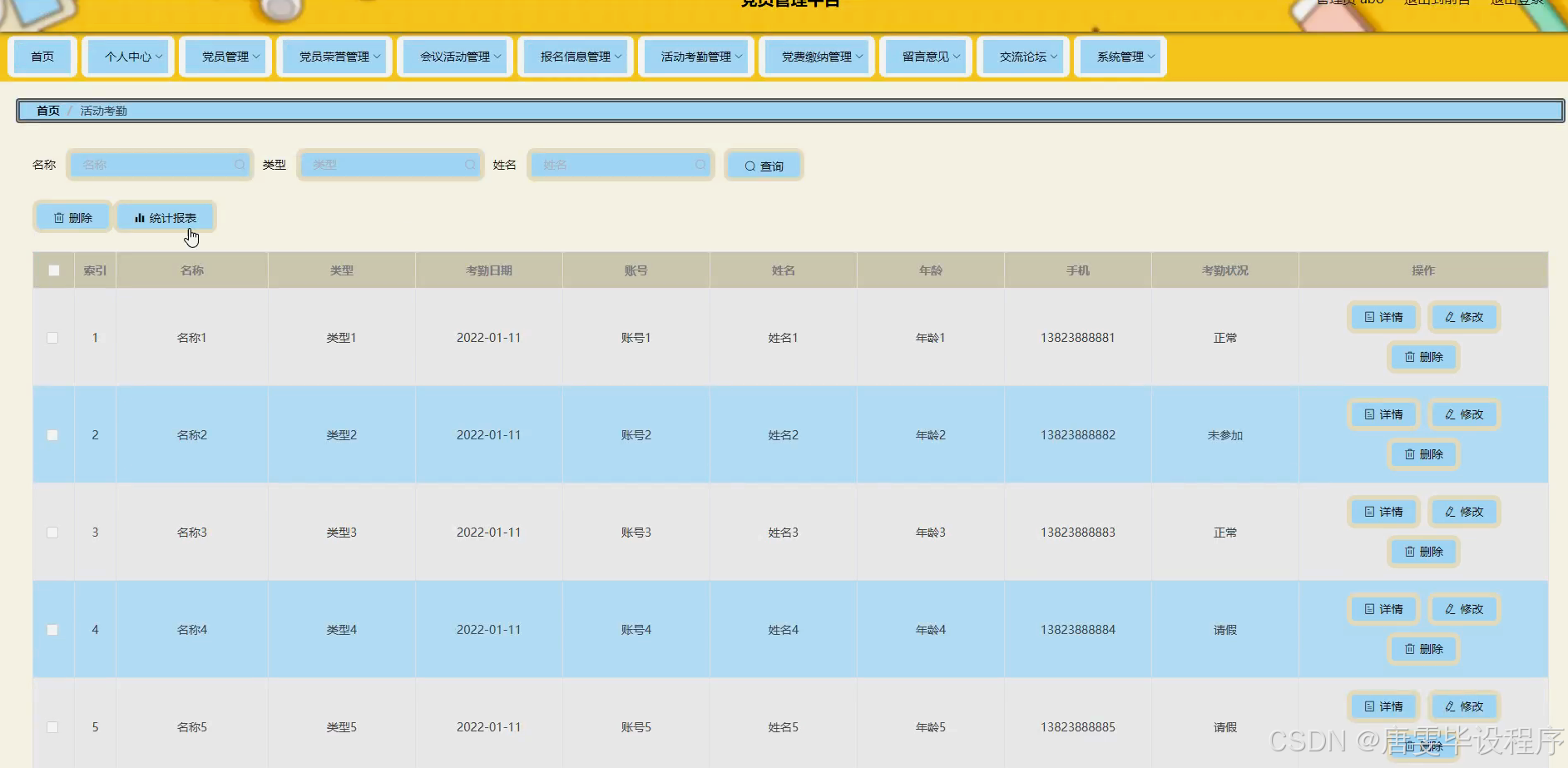 五是活动考勤管理模块,通过数字化手段记录党员的活动参与情况,为党员考核提供依据;