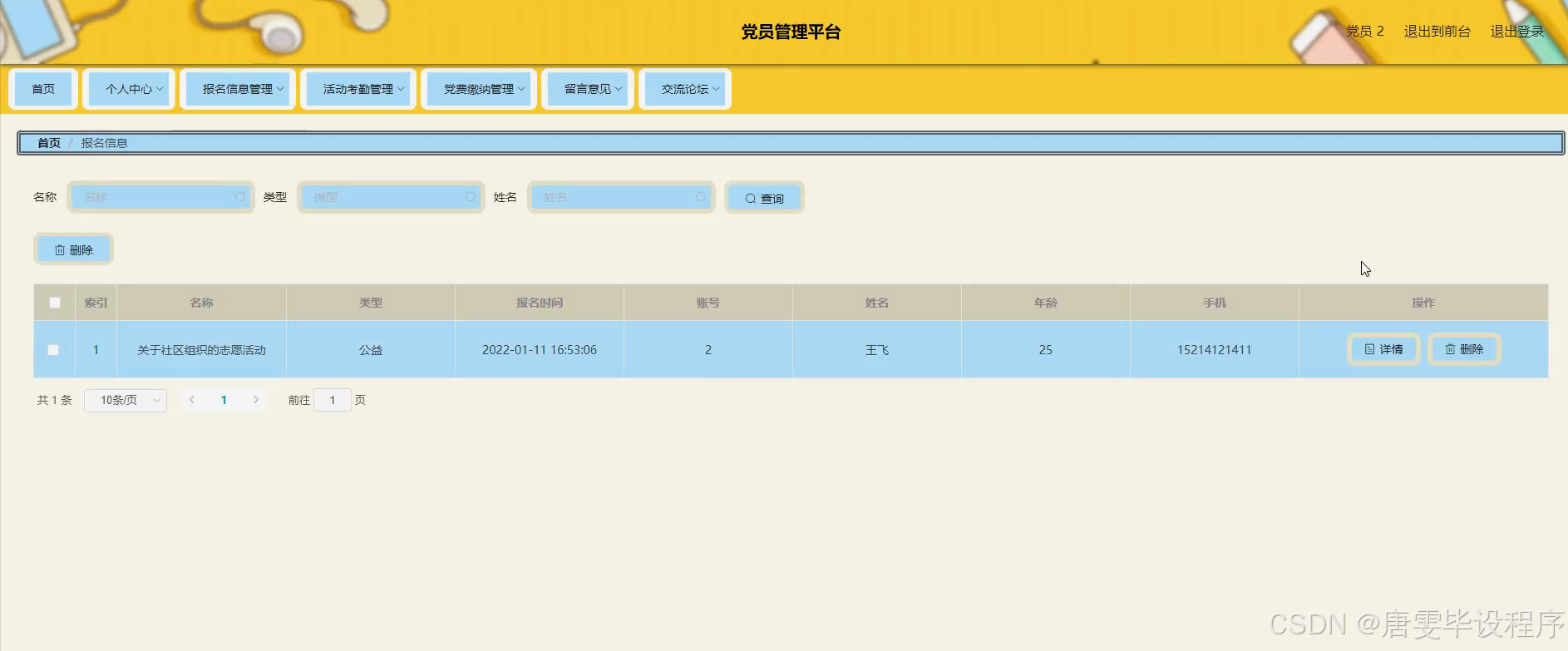 三是报名信息管理模块,记录党员的报名情况,为活动组织提供数据支持;