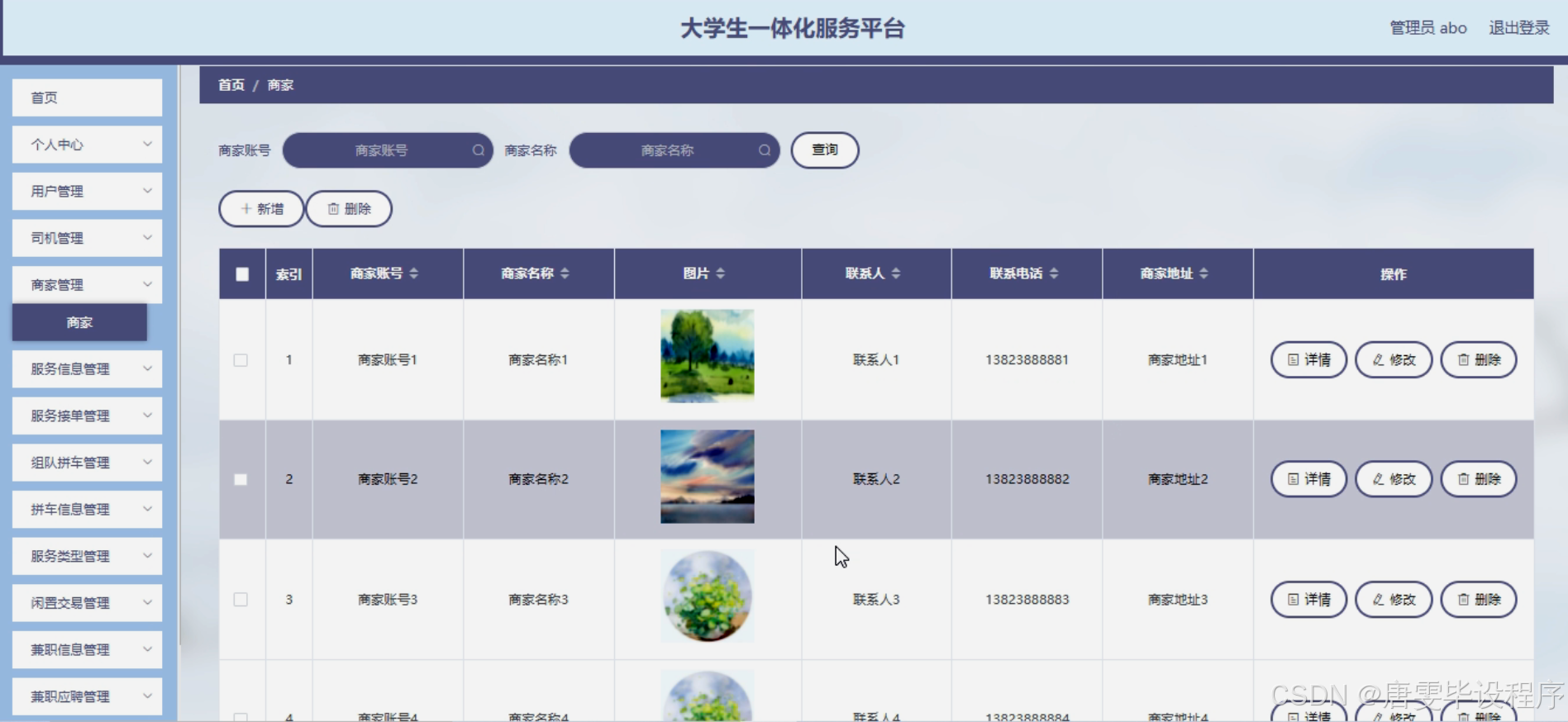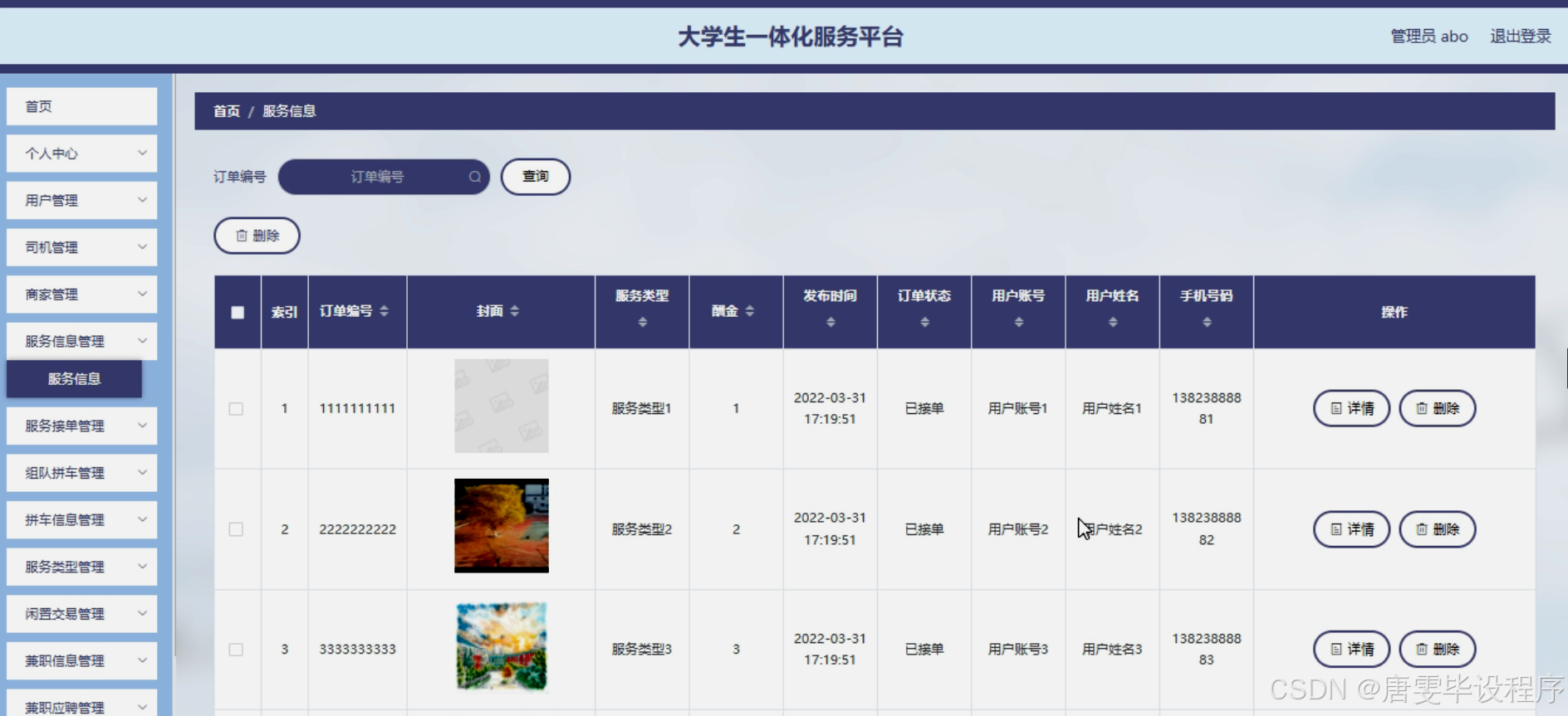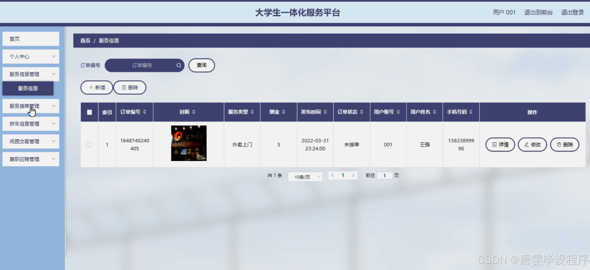 本研究旨在设计并实现一个功能完善、操作便捷的大学生一体化服务平台,以满足大学生在校园生活中的多元化需求。通过该平台,用户可以轻松发布和查询服务信息,司机和商家可以快速响应并接单,实现服务的快速匹配和高效执行。同时,平台还将提供组队拼车、闲置交易、兼职信息发布与应聘等附加功能,以进一步提升用户体验和校园生活的便捷性。通过本研究的实施,我们期望能够为大学生打造一个更加智能、便捷、高效的校园生活服务平台。