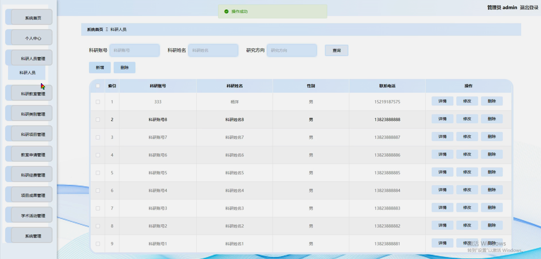 - 科研人员管理:建立科研人员档案库,记录个人信息、研究方向及成果,支持团队组建与协作。