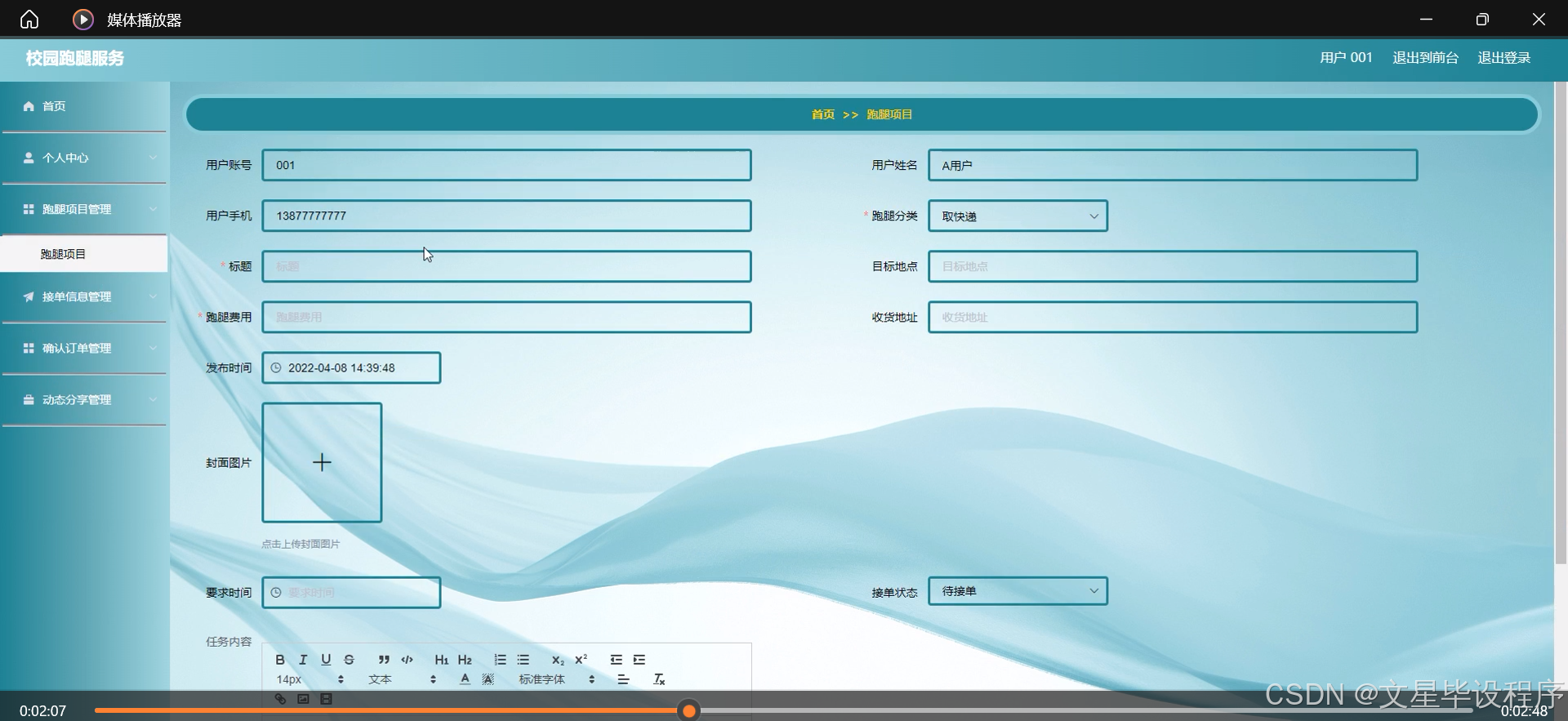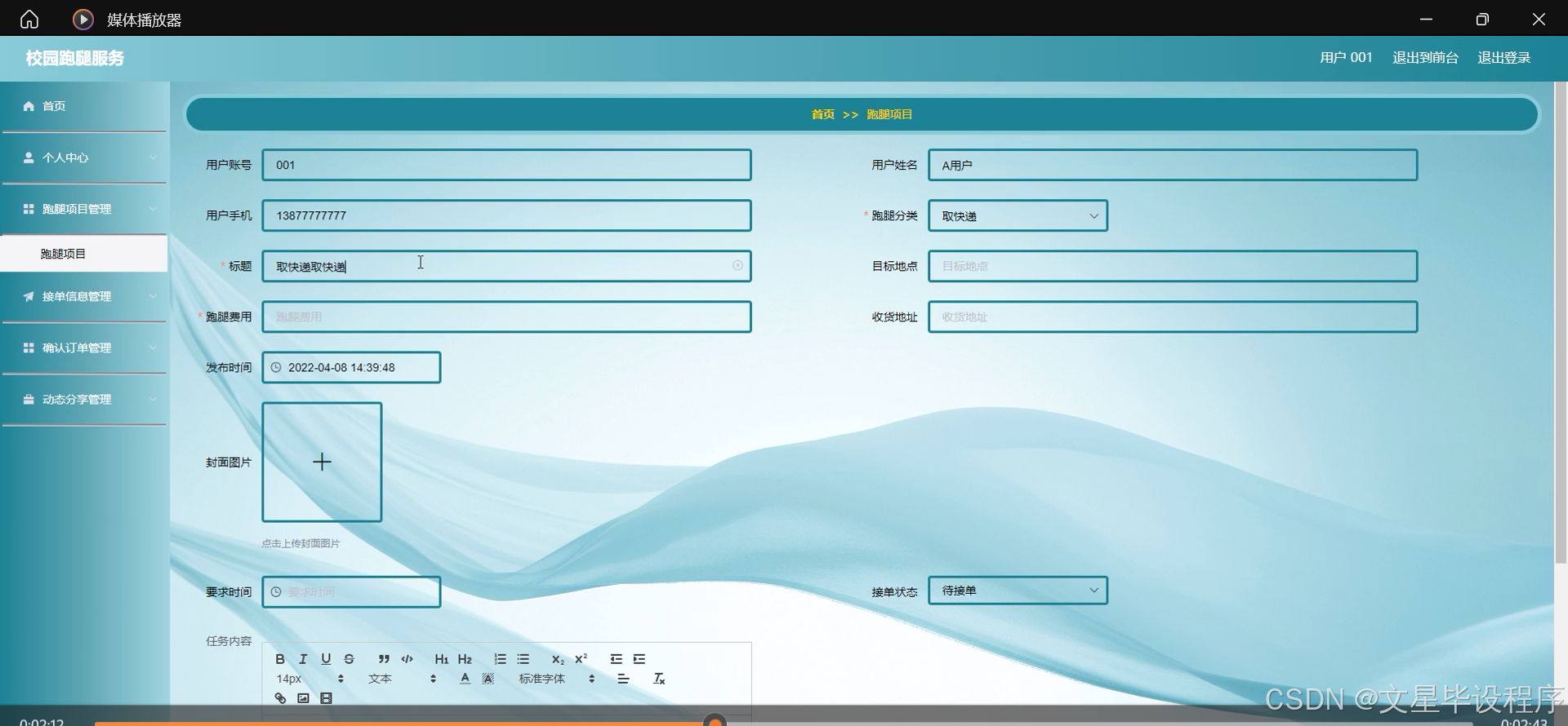 本研究内容主要包括校园跑腿服务平台的设计与实现,具体涵盖用户管理、跑腿员管理、跑腿分类管理、跑腿项目管理、接单信息管理、确认订单管理、动态分享管理和交易反馈管理等功能模块。用户管理模块实现用户注册、登录、个人信息管理等功能;跑腿员管理模块提供跑腿员入驻、接单、评价等功能;跑腿分类和项目管理模块对跑腿服务进行分类和项目管理,方便用户选择;接单信息、确认订单和动态分享模块实现订单的发布、接收、确认和分享功能;交易反馈模块提供用户对服务的评价和反馈功能。通过这些模块的设计与实现,构建一个功能完善、安全可靠的校园跑腿服务平台。