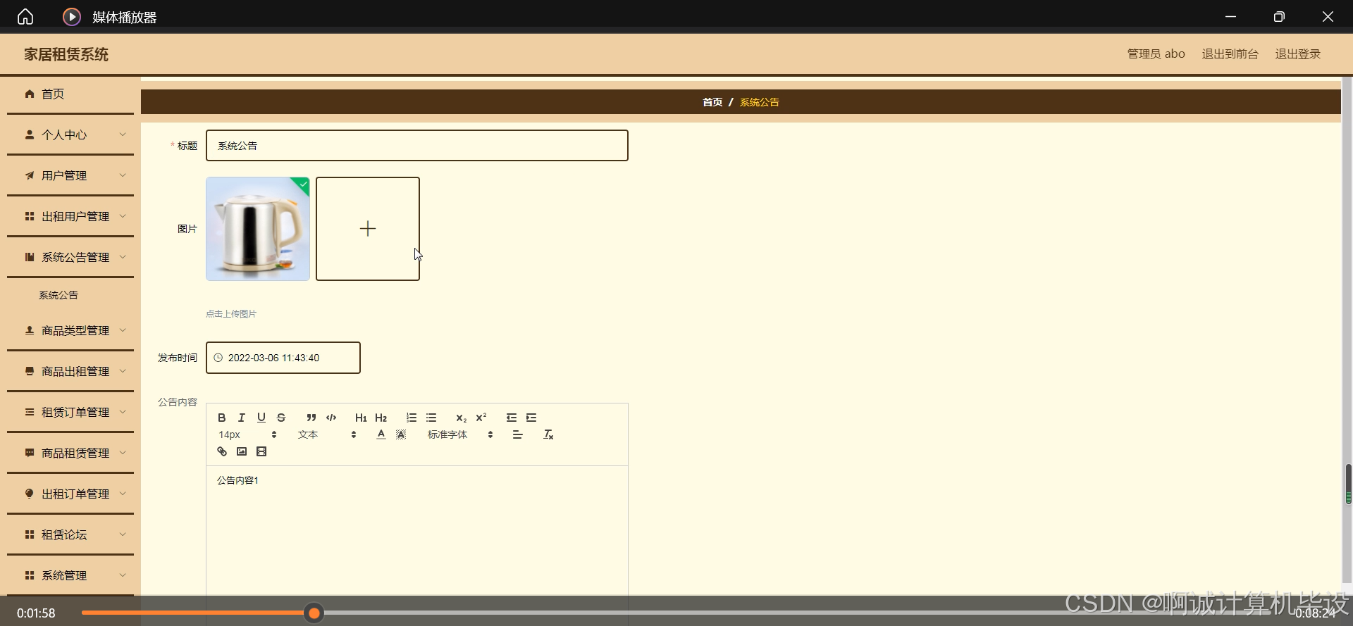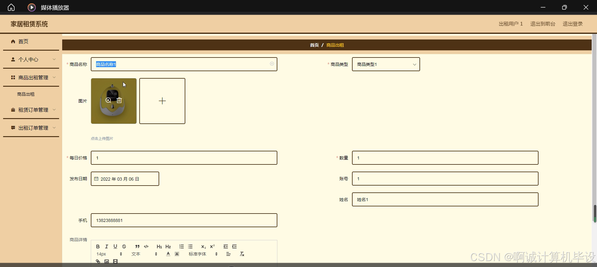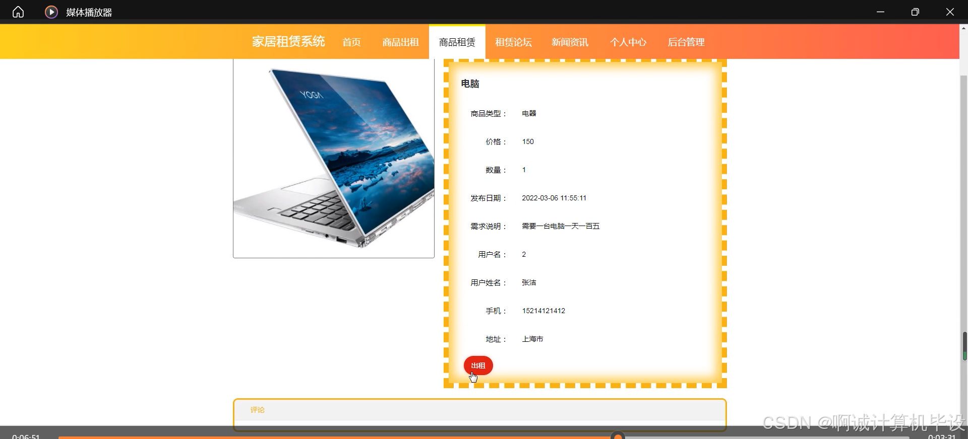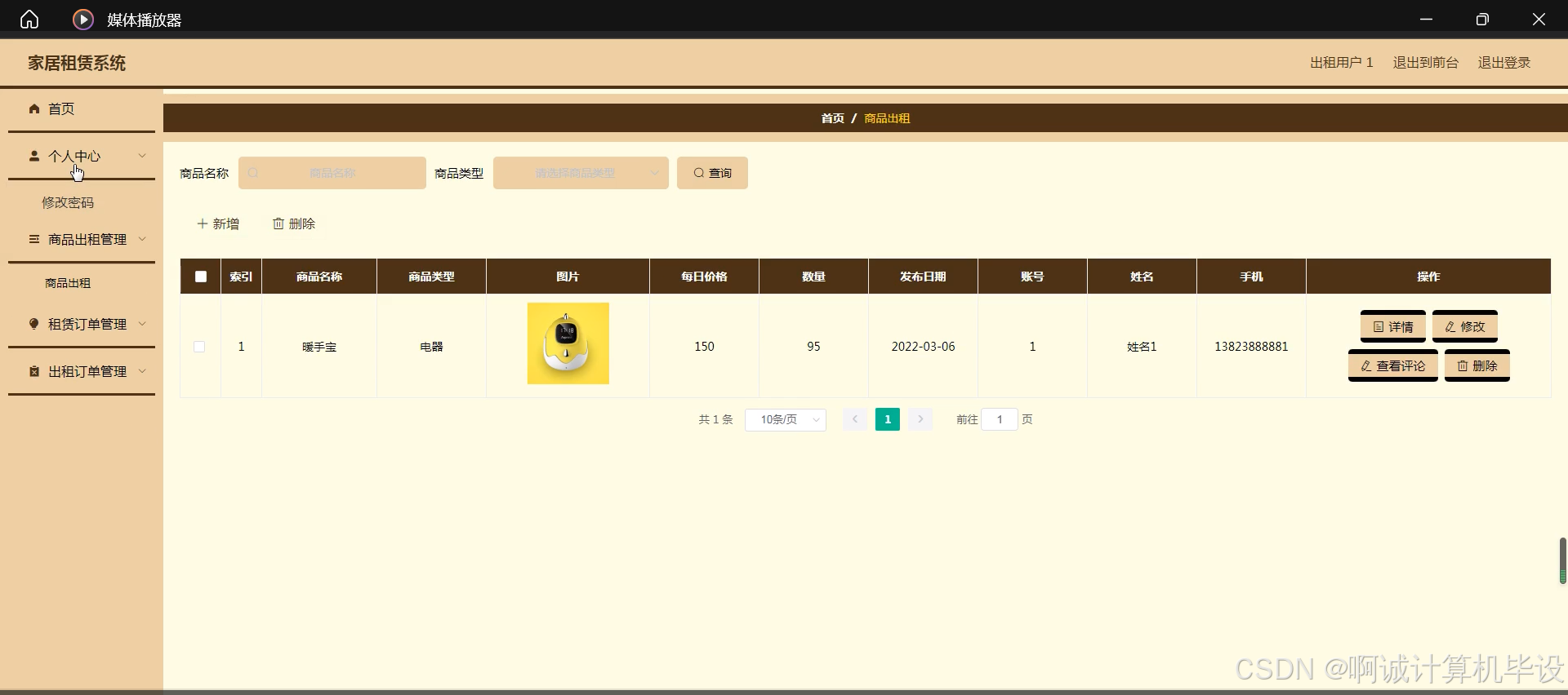 本研究将围绕家居租赁系统的核心功能展开,包括用户管理、出租用户管理、系统公告发布、商品类型划分、商品出租管理、租赁订单处理、商品租赁追踪以及出租订单统计等。通过对这些功能模块的详细设计和优化,构建一个高效、便捷、安全的家居租赁系统,以满足广大消费者的多样化需求。