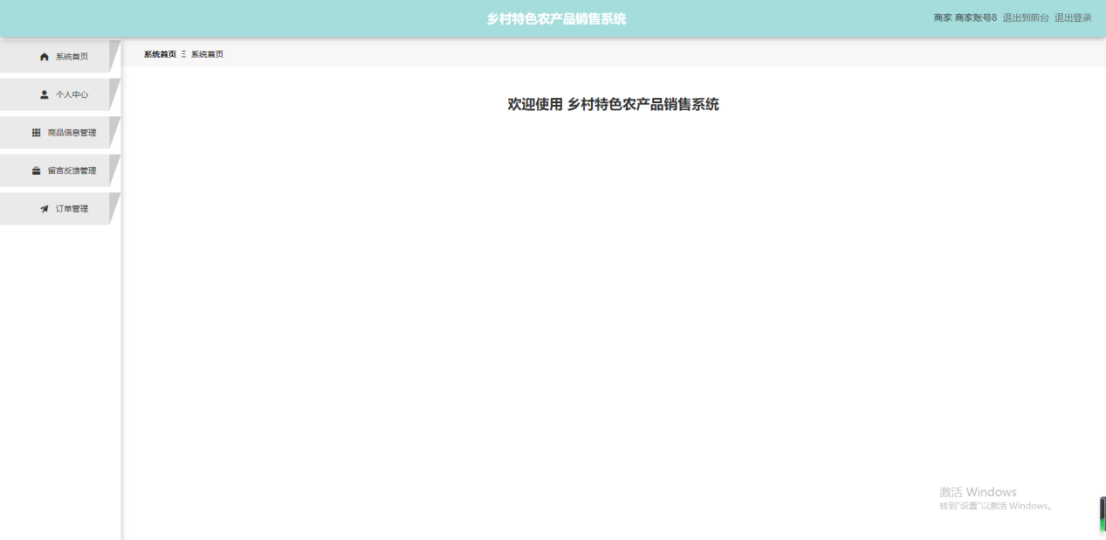 商家进入系统可以对首页,个人中心,商品信息管理,留言反馈管理,订单管理等功能进行操作。商家主界面如图5-14所示: