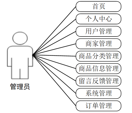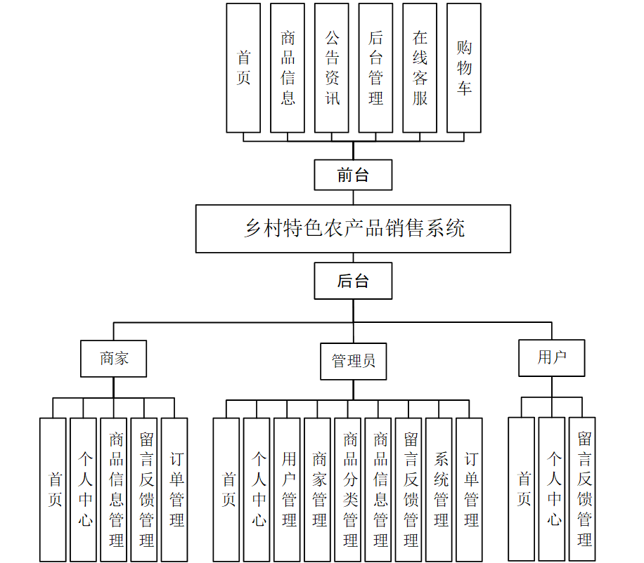 乡村特色农产品销售系统的使用者主要有三类用户,一类是管理员,他拥有整个系统的最高权限,然后是用户和商家,都能对自己的个人信息和部门功能进行操作进行操作。系统根据这三类用户,划分出了三大功能模块。