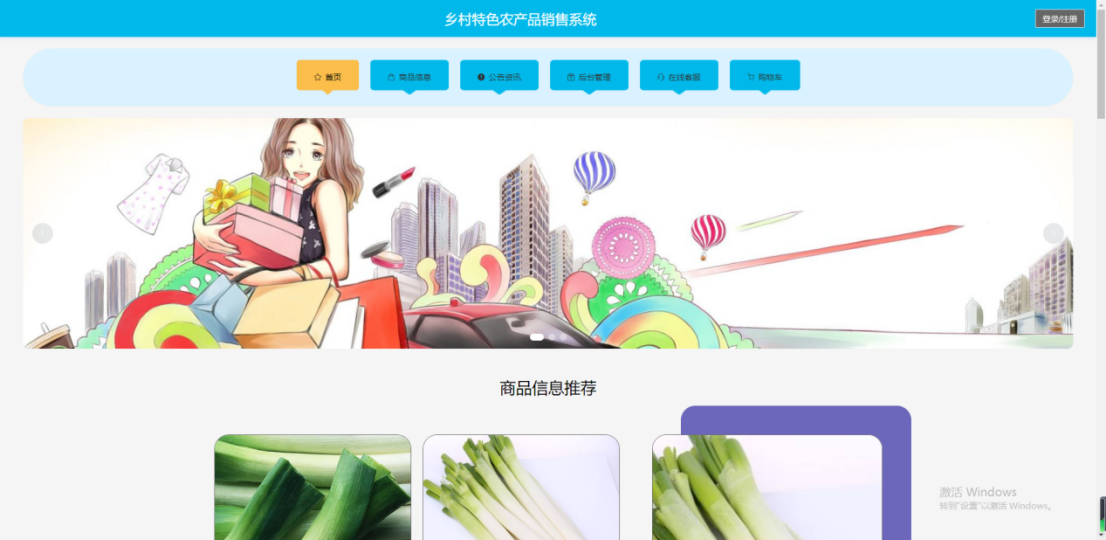 当人们打开系统的网址后,首先看到的就是首页界面。在这里,人们能够看到乡村特色农产品销售系统的导航条,通过导航条进入各信息展示页面进行操作。系统首页界面如图5-1所示: