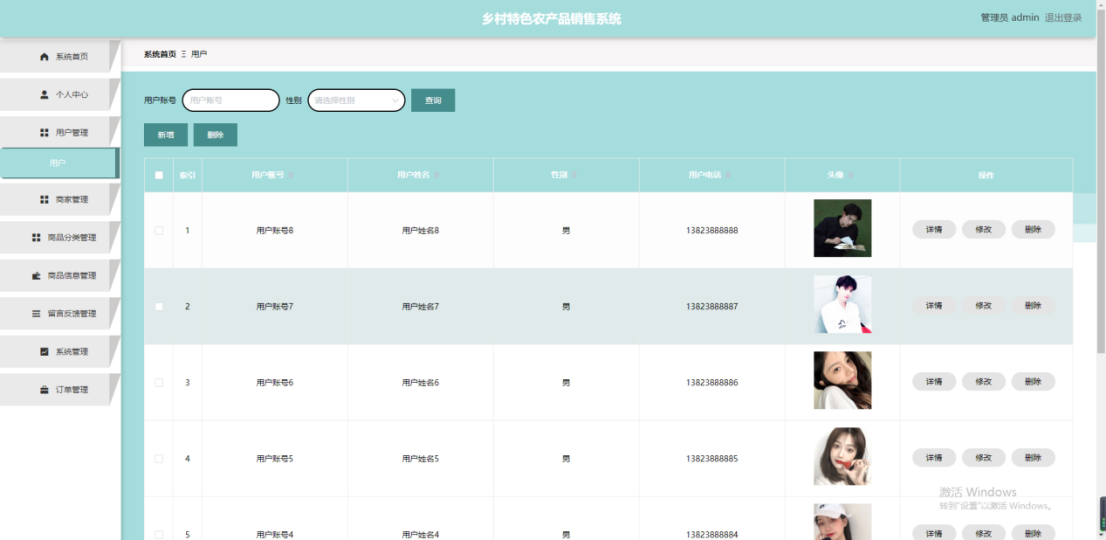 管理员点击用户管理。在用户页面输入用户账号,性别进行查询、新增或删除用户列表,并根据需要对用户详情信息进行详情、修改或删除操作;如图5-7所示: