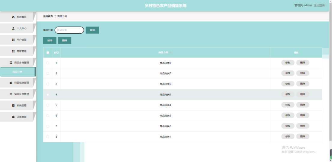 管理员点击商品分类管理。在商品分类页面输入商品分类进行查询、新增或删除商品分类列表,并根据需要对商品分类详情信息进行修改或删除操作;如图5-9所示: