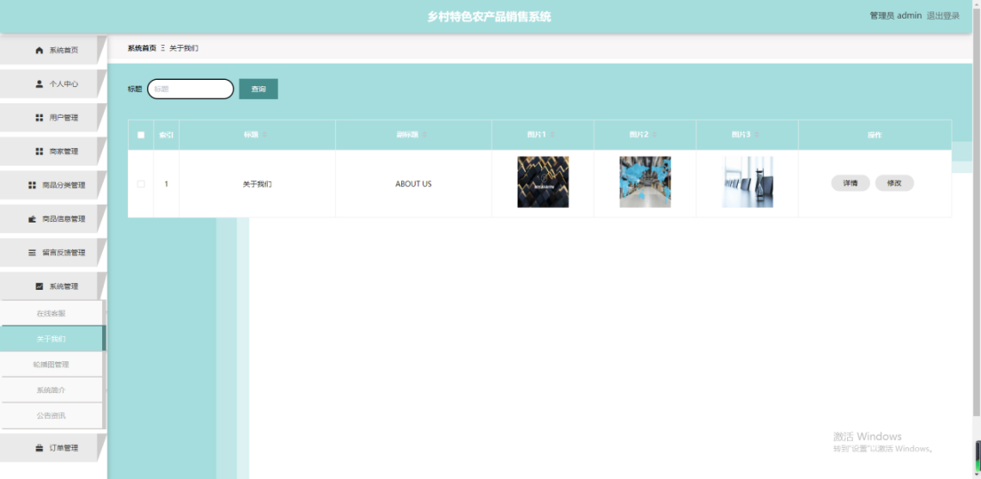 管理员点击系统管理。在关于我们页面输入标题进行查询关于我们列表,并根据需要对关于我们详情信息进行详情、修改操作,还可以对在线客服、轮播图管理、系统简介、公告资讯进行详细操作;如图5-12所示: