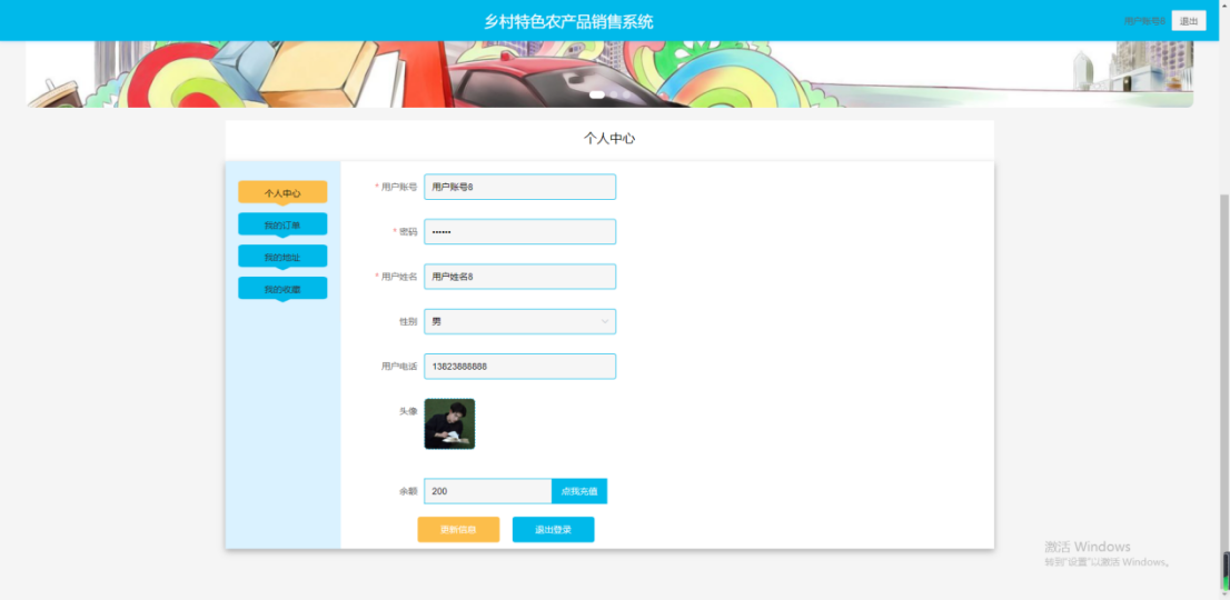 个人中心:在个人中心页面通过填写个人详细信息进行信息更新操作,还可以根据需要对我的订单、我的地址和我的收藏进行详细操作;如图5-4所示: