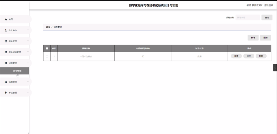 教师点击试卷管理。在试卷页面输入试卷名称进行查询、新增或删除试卷列表,并根据需要对试卷详情信息进行详情、修改或删除操作;如图5-13所示: