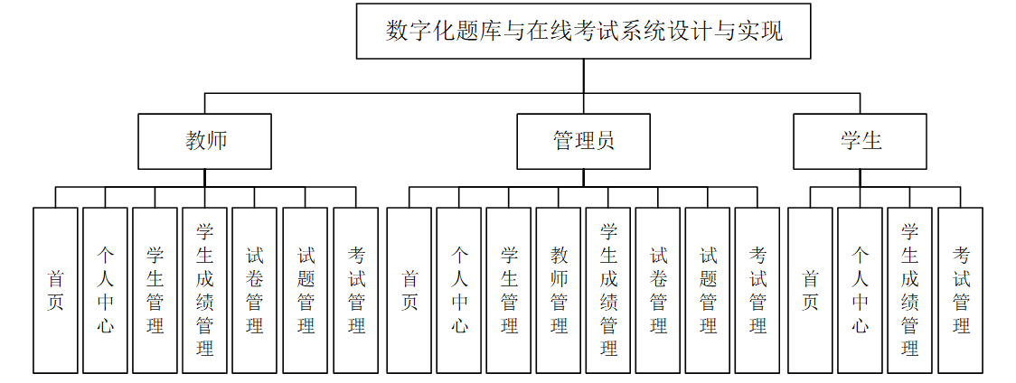 为了更好的去理清本系统整体思路,对该系统以结构图的形式表达出来,设计实现该数字化题库与在线考试系统的功能结构图如下所示: