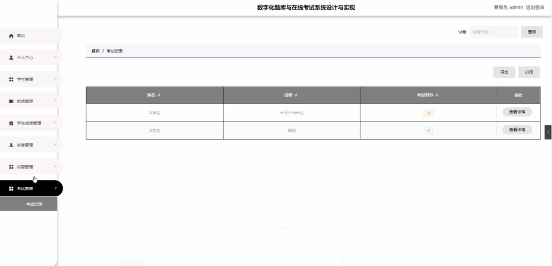 管理员点击考试管理。在考试记录页面输入试卷进行查询、导出或打印列表,并根据需要对考试记录详情信息进行查看详情操作;如图5-9所示: