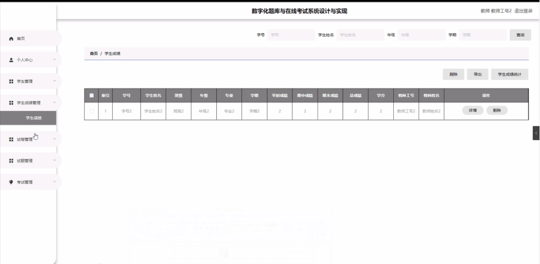 教师点击学生成绩管理。在学生成绩页面输入学号、学生姓名、年级和学期进行查询、删除、导出或学生成绩统计学生成绩列表,并根据需要对学生成绩详情信息进行详情或删除操作;如图5-12所示: