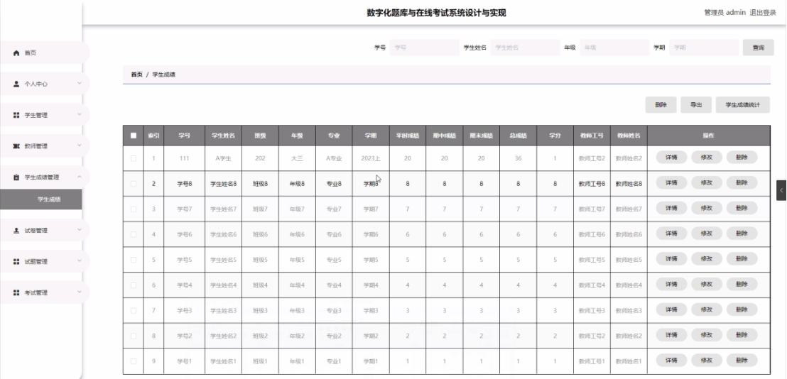 管理员点击学生成绩管理。在学生成绩页面输入学号、学生姓名、年级和学期进行查询、删除、导出或学生成绩统计学生成绩列表,并根据需要对学生成绩详情信息进行详情、修改或删除操作;如图5-6所示: