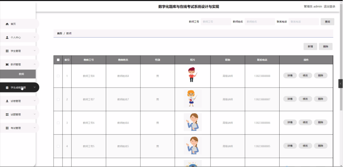 管理员点击教师管理。在教师页面输入教师工号、教师姓名和联系电话进行查询、新增或删除教师列表,并根据需要对教师详情信息进行详情、修改或删除操作;如图5-5所示: