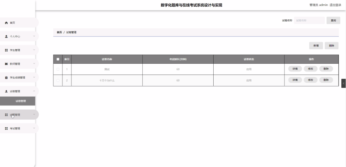 管理员点击试卷管理。在试卷页面输入试题名称进行查询、新增或删除试卷列表,并根据需要对试卷详情信息进行详情、修改或删除操作;如图5-7所示: