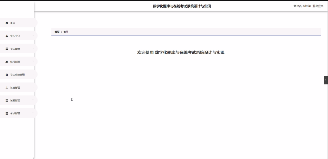 管理员进入主页面,主要功能包括对首页、个人中心、学生管理、教师管理、学生成绩管理、试卷管理、试题管理、考试管理等进行操作。管理员主页面如图5-3所示: