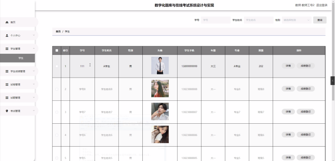 教师点击学生管理。在学生页面输入学号、学生姓名和选择性别进行查询学生列表,并根据需要对学生详情信息进行详情或成绩登记操作;如图5-11所示: