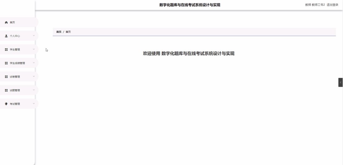 教师进入主页面,主要功能包括对首页、个人中心、学生管理、学生成绩管理、试卷管理、试题管理、考试管理等进行操作。教师主页面如图5-10所示:
