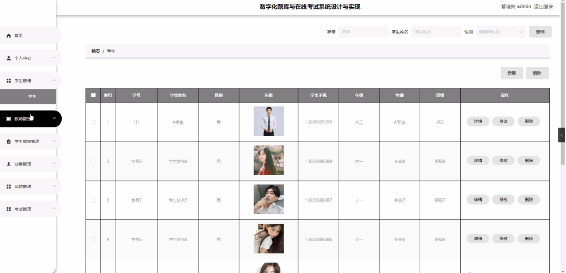 管理员点击学生管理。在学生页面输入学号、学生姓名和选择性别进行查询、新增或删除学生列表,并根据需要对学生详情信息进行详情、修改或删除操作;如图5-4所示: