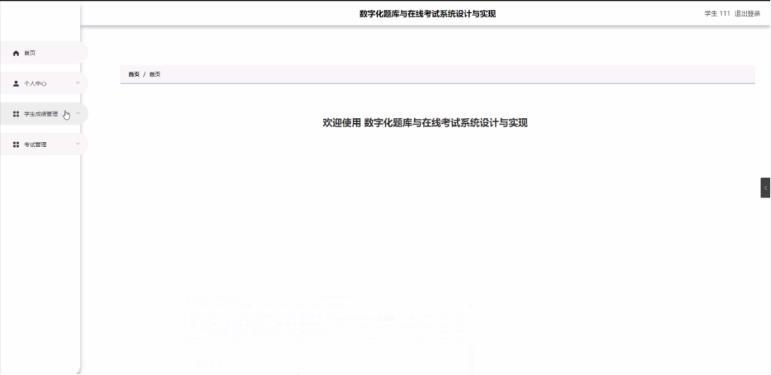 学生进入主页面,主要功能包括对首页、个人中心、学生管理、教师管理、学生成绩管理、试卷管理、试题管理、考试管理等进行操作。学生主页面如图5-15所示: